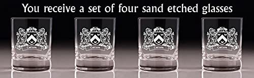 Product description: Carson Irish Coat of Arms Old Fashioned Tumblers - Set of 4. Sometimes, bigger is better! These taller, wider tumbler glasses are perfect for craft cocktails and whiskey. It's larger size allows room for our fan favorite "Lions" design, which is expertly and permanently sand-etched into each tumbler with your very own Irish Coat of Arms and Surname! These lavish Master's Reserve glasses undergo DuraTemp treatment to increase chip resistance, feature a clean beadless rim, thin walls, and a heavy base with a luxurious feel. Each glass was made to complement your finest whiskies and elevate the presentation and experience of your drink.