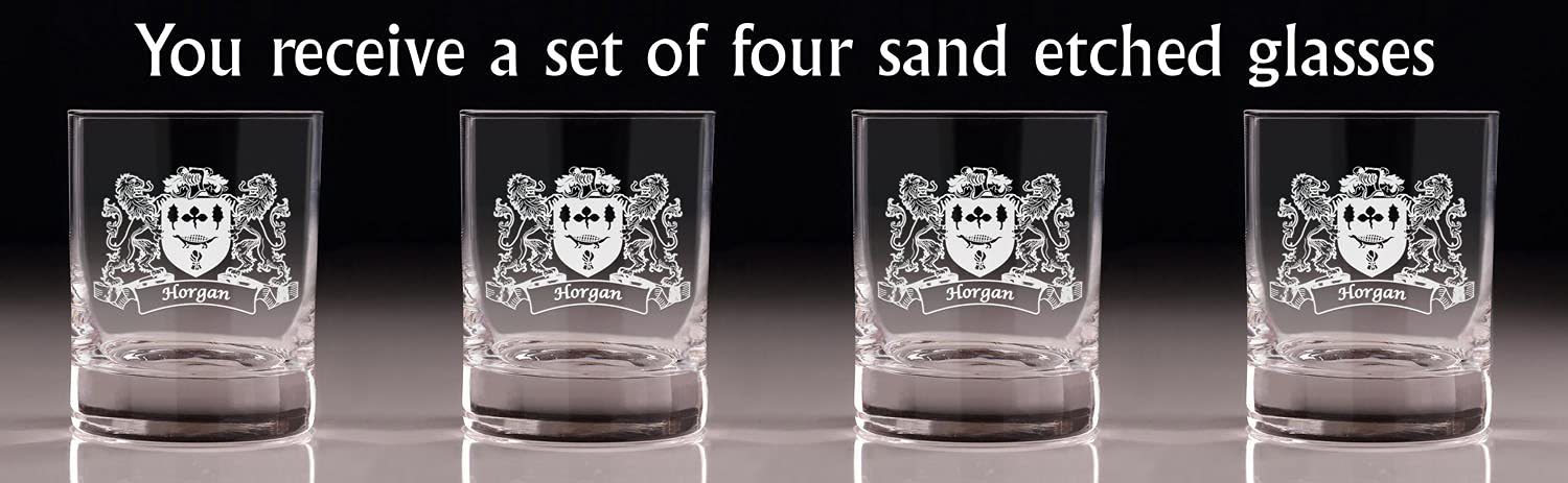 Product description: Horgan Irish Coat of Arms Old Fashioned Tumblers - Set of 4. Sometimes, bigger is better! These taller, wider tumbler glasses are perfect for craft cocktails and whiskey. It's larger size allows room for our fan favorite "Lions" design, which is expertly and permanently sand-etched into each tumbler with your very own Irish Coat of Arms and Surname! These lavish Master's Reserve glasses undergo DuraTemp treatment to increase chip resistance, feature a clean beadless rim, thin walls, and a heavy base with a luxurious feel. Each glass was made to complement your finest whiskies and elevate the presentation and experience of your drink.