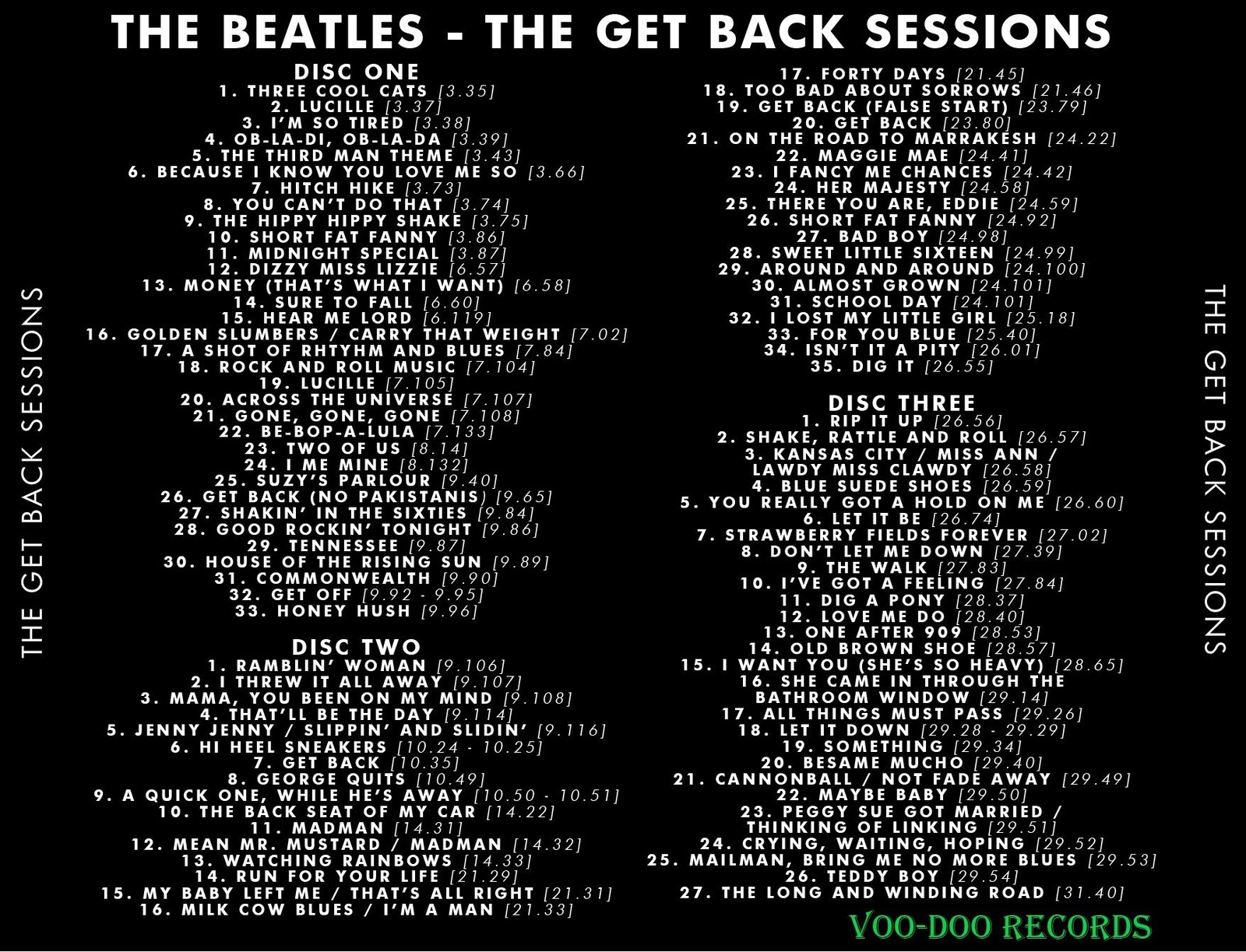 Fantastic three disc set which compiles the best moments from the Beatles' January 1969 which produced the 'Let It Be' (originally titled 'Get Back') film and album, all taken from the original mono tapes. Hear the group as they jam away on numerous Rock and Roll classics, along with early, never published Lennon-McCartney originals like 'Because I Know You Love Me So', 'I Fancy Me Chances' and 'Thinking Of Linking'. There are even 1969 versions of earlier Beatles songs like 'Love Me Do', 'You Can't Do That' and 'Strawberry Fields Forever', along with early takes of songs which would later turn up on Abbey Road and the first few solo albums. Alternate versions of every song from 'Let It Be' are presented as well. All of the music has been captured via the mono tapes that were running as the cameras were rolling. The music has been remastered, and as a result has never sounded better! This fan-made collection contains all of the high points from the over 80 hours of tapes that were rcorded during the January 1969 sessions, distilled to a four-hour "Best Of" over the three discs. Thought and care were given to the deluxe package design as well, which is high quality, with full color artwork and printed disc art. The set looks and sounds amazing!! The perfect gift for any Beatle fan!!