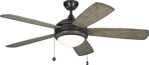 The Discus 52 LED in Aged Pewter features a 153.0 X 18.0 3-speed motor with a Twelve-degree blade pitch. We've expanded the best-selling Discus 52" fan by adding traditional detailing to the housing that elevates the design. The 5-blade Discus features an integrated 20W LED light with 715 lumens output, pull-chain operation with three speeds and manual reverse.