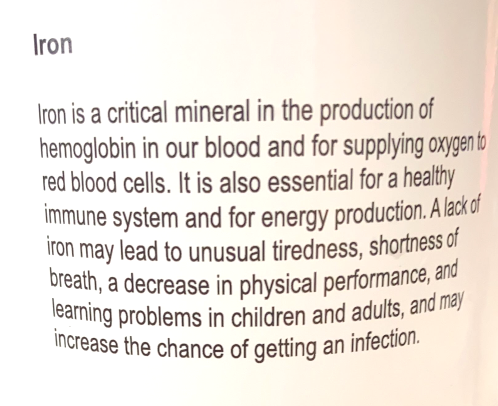 Lack of iron can cause unusual tiredness, shortness of breath, decreased physical performance, and learning problems in children and adults, and can increase the chance of getting an infection.