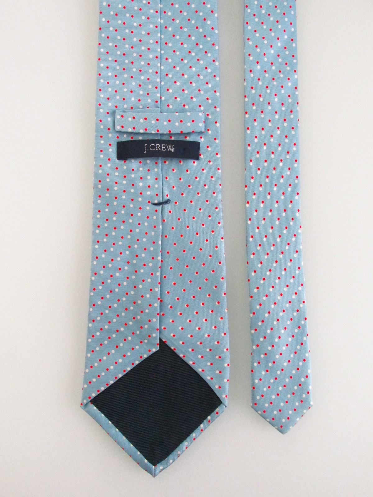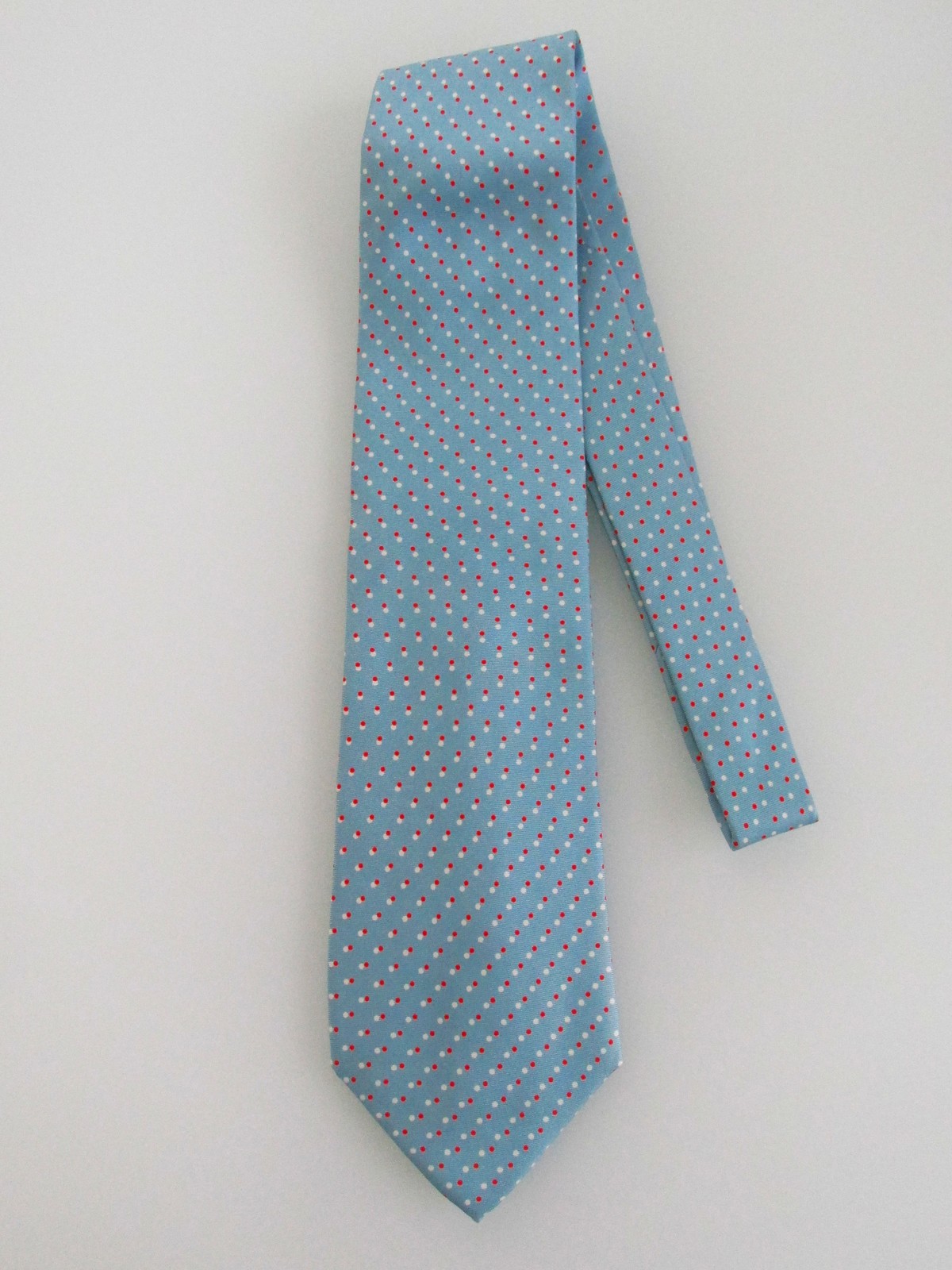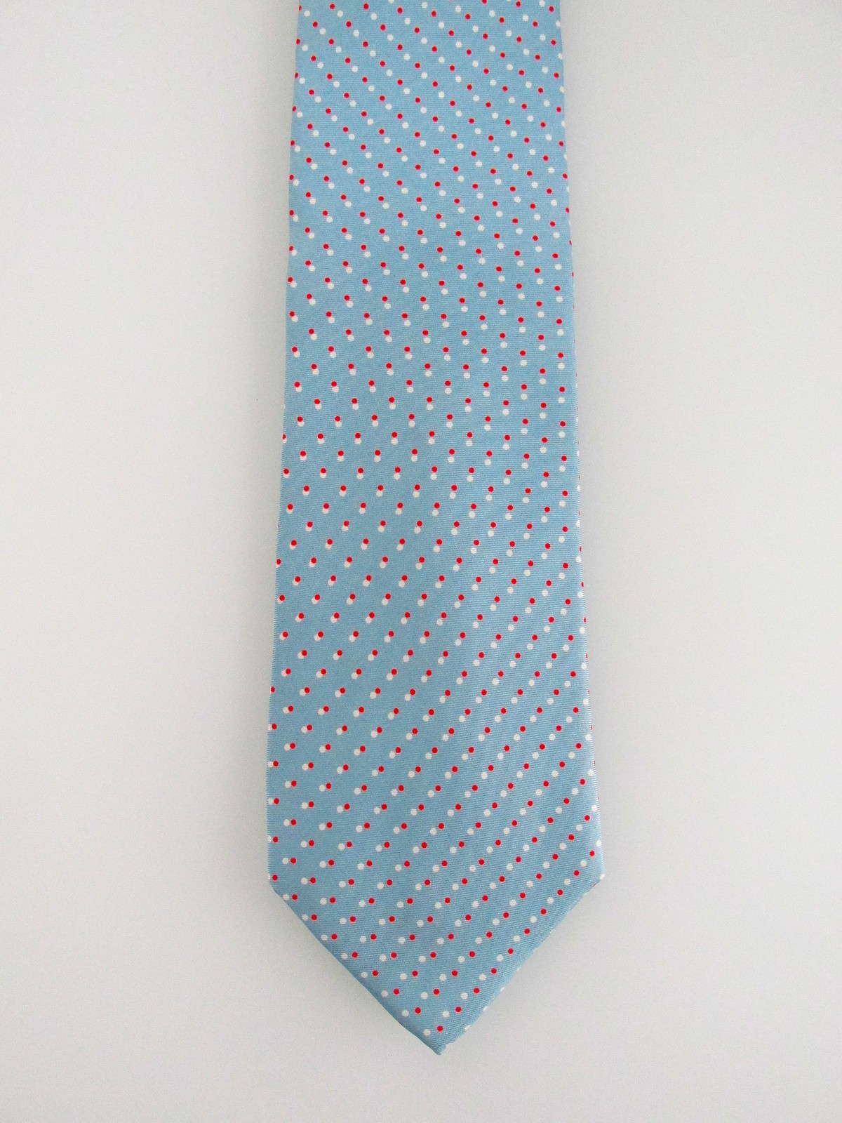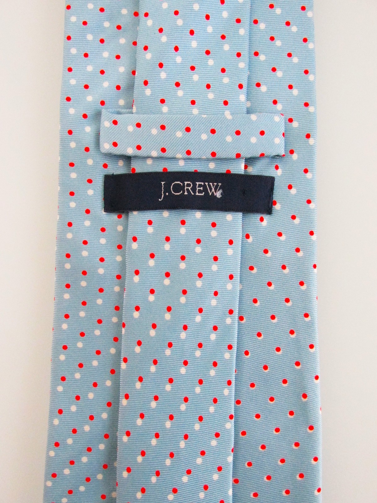 Description: Up for sale is a J. Crew men's silk tie. The tie is handmade in Italy of 100% silk. The tie has a small polka dot pattern in white red on a light blue background. Dimensions are approximately 57" long x 3.75" wide. This tie is in excellent condition.