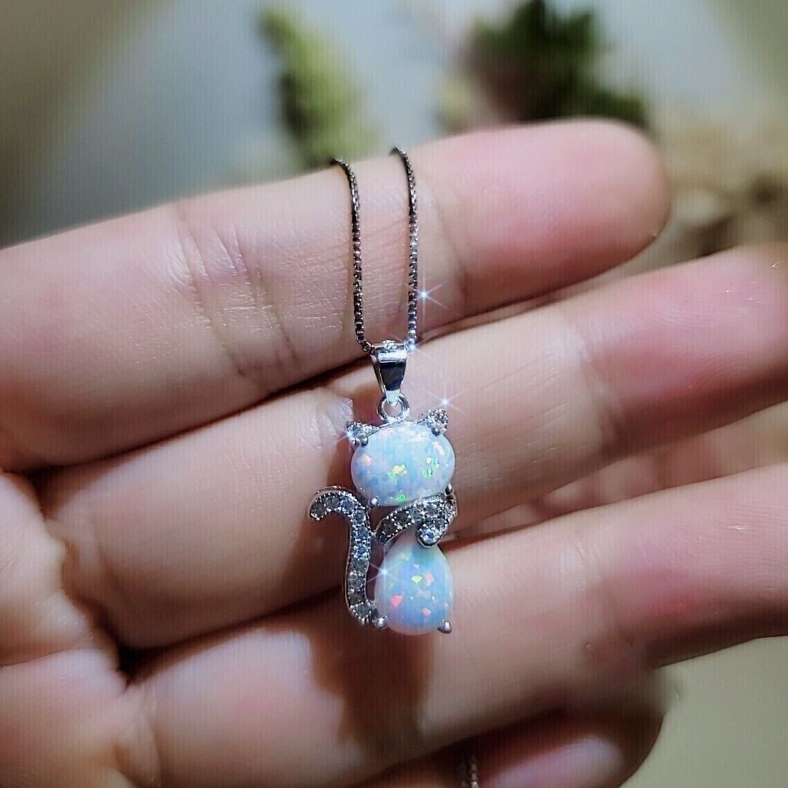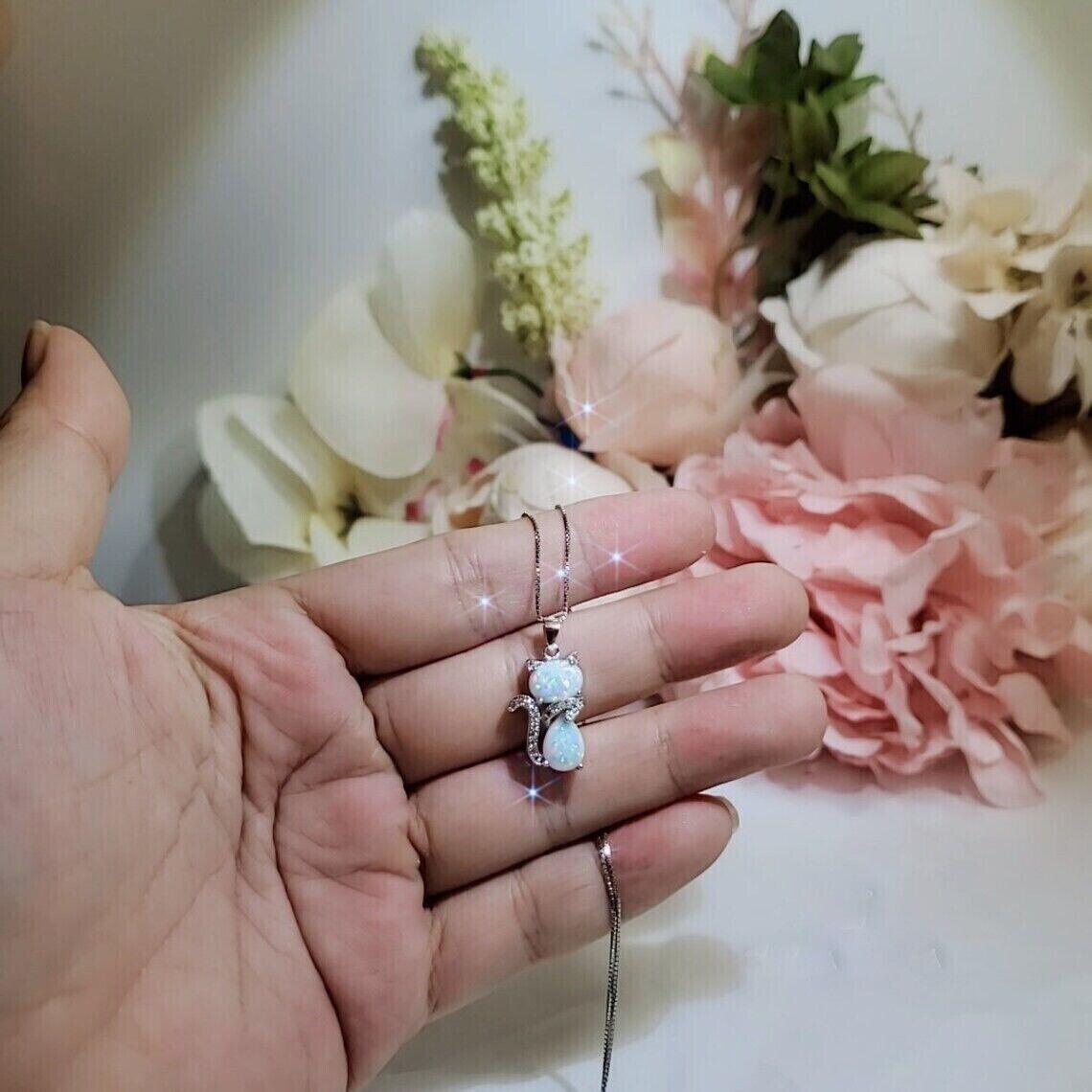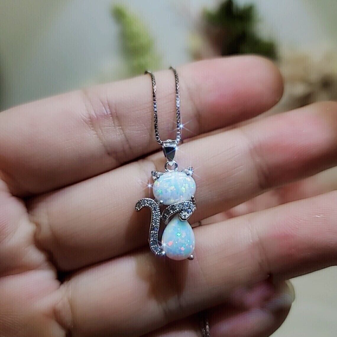 2.00Ct Oval Cut CZ Fire Opal Cute Kitty Cat Pendant 14K White Gold Plated