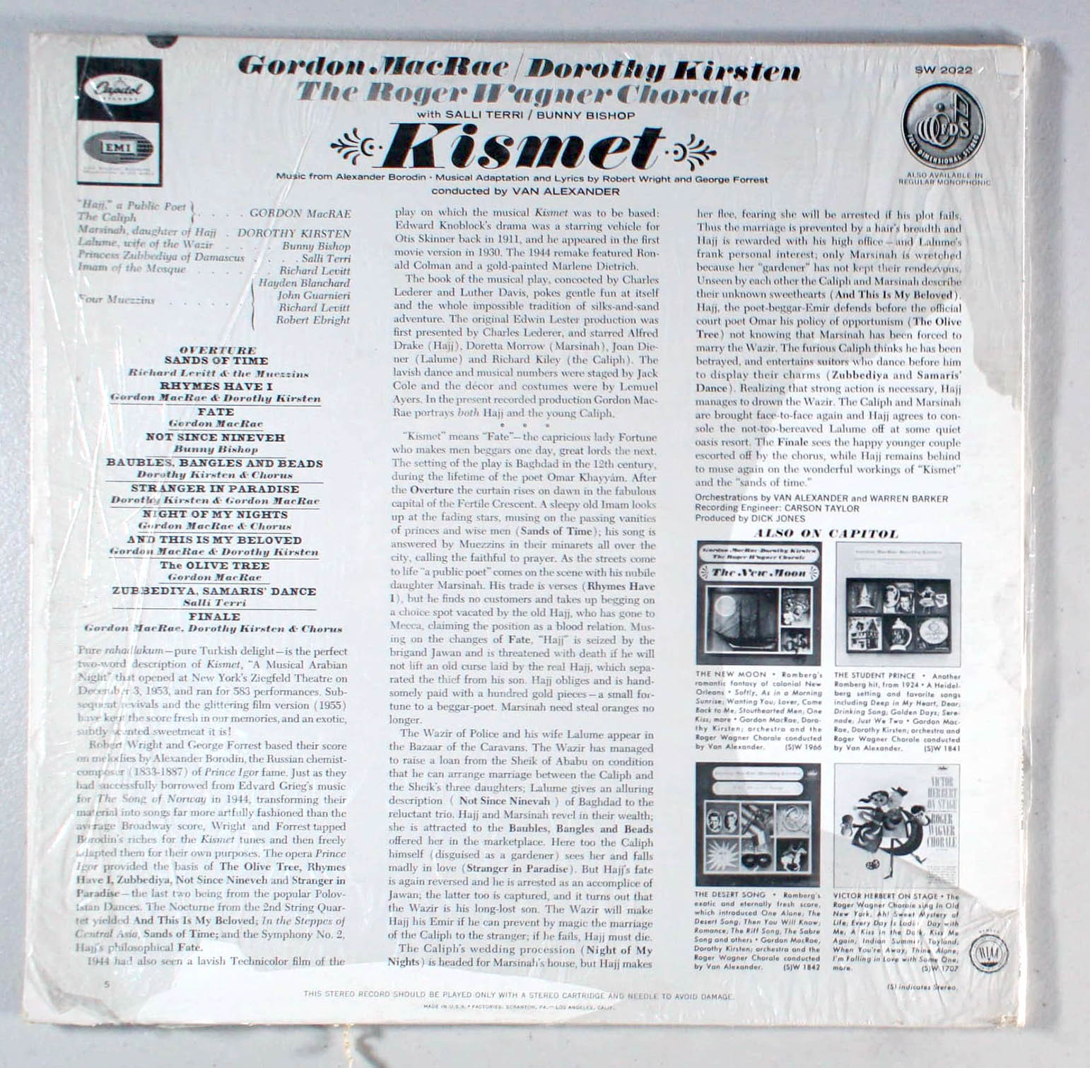 Kismet, performed by Gordon MacRae and Dorothy Kirsten, was the soundtrack for the Broadway musical of the same name. Joining them were The Roger Wagner Chorale, Salli Terri, and Bunny Bishop. This release features songs from the Tony Award winning musical like Fate, And This Is My Beloved, Stranger In Paradise, and And This Is My Beloved. The story concerns a wily poet who talks his way out of trouble several times; meanwhile, his beautiful daughter meets and falls in love with the young caliph. Kismet is set in a fictional Baghdad in the times of The Arabian Nights.