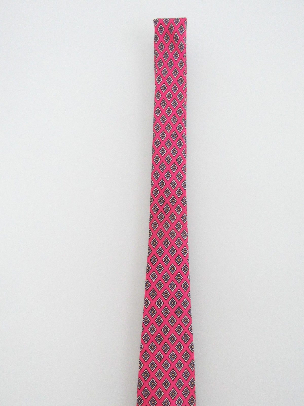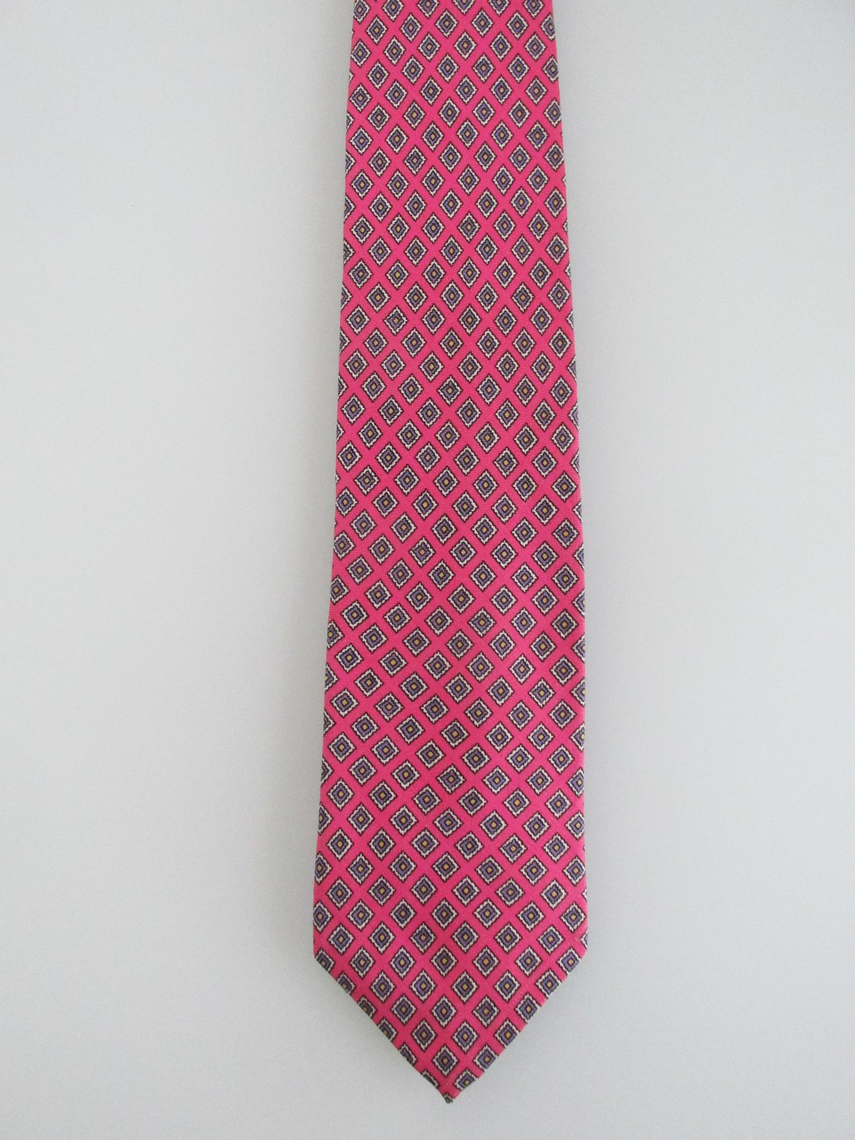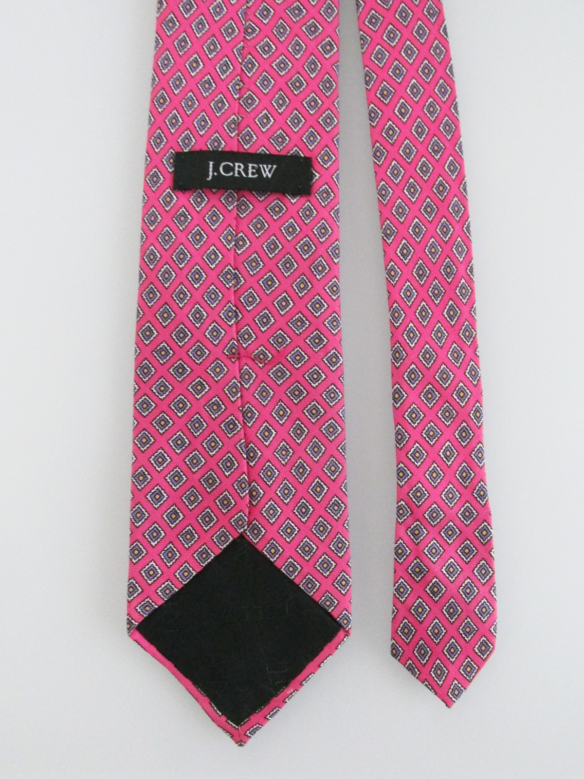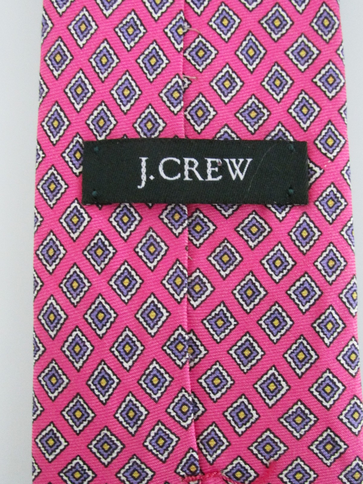 Description: Up for sale is a J. Crew men's silk tie. The tie is handmade in the USA of 100% silk. The tie has a small geometric pattern in purple, white yellow on a pink background. Dimensions are approximately 58" long x 3.00" wide. This tie is in excellent condition.