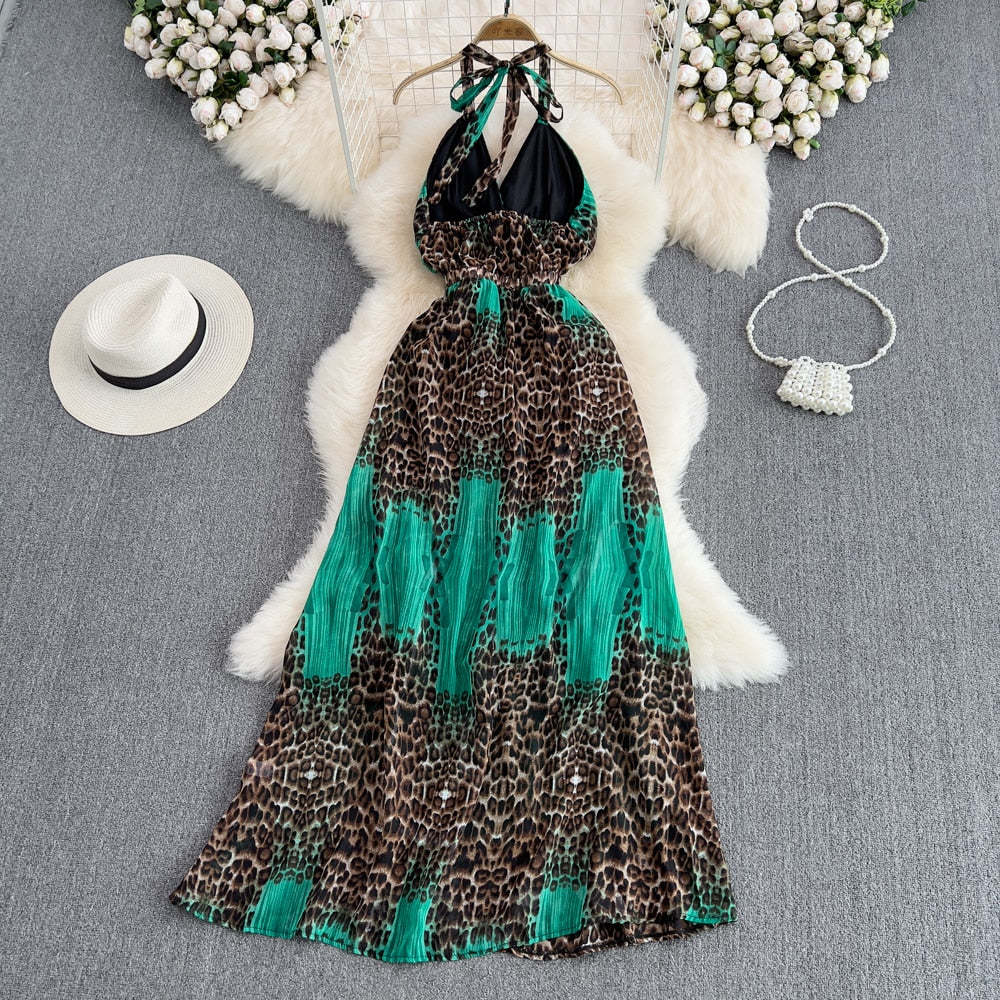 Vintage Boho Sexy Halter Neck Leopard Print Summer Maxi Dress