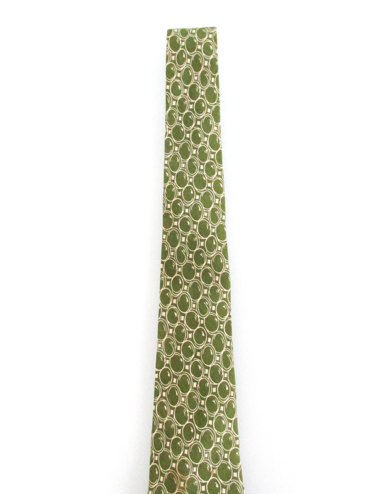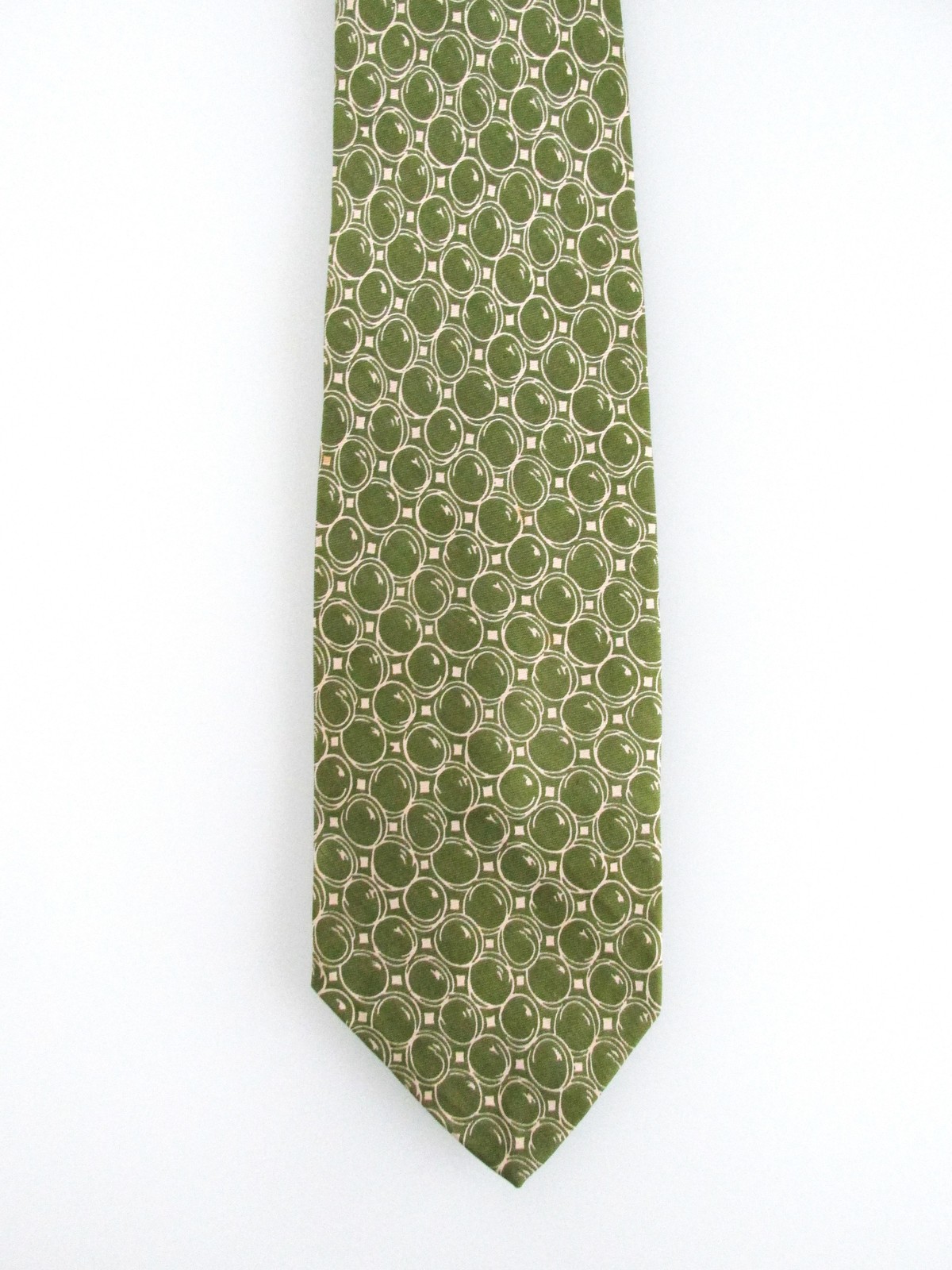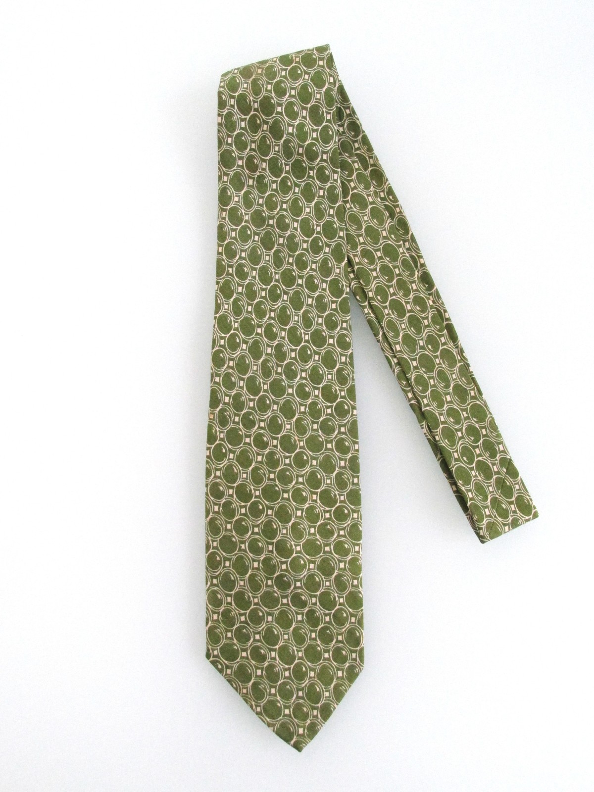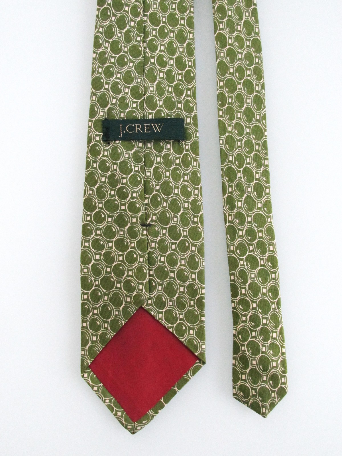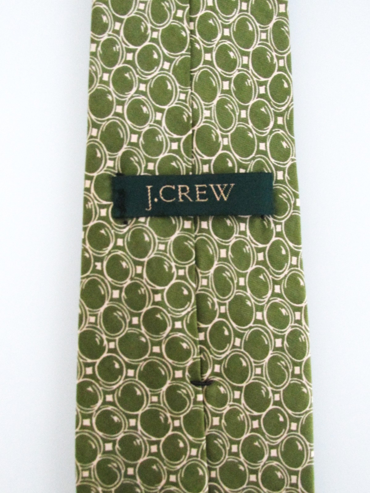 Description: Up for sale is a J. Crew men's vintage silk tie. The tie is handmade in the USA of 100% silk. The tie has an abstract pattern in tan on an olive green background. Dimensions are approximately 54" long x 3 3/8" wide. This tie is in excellent condition.