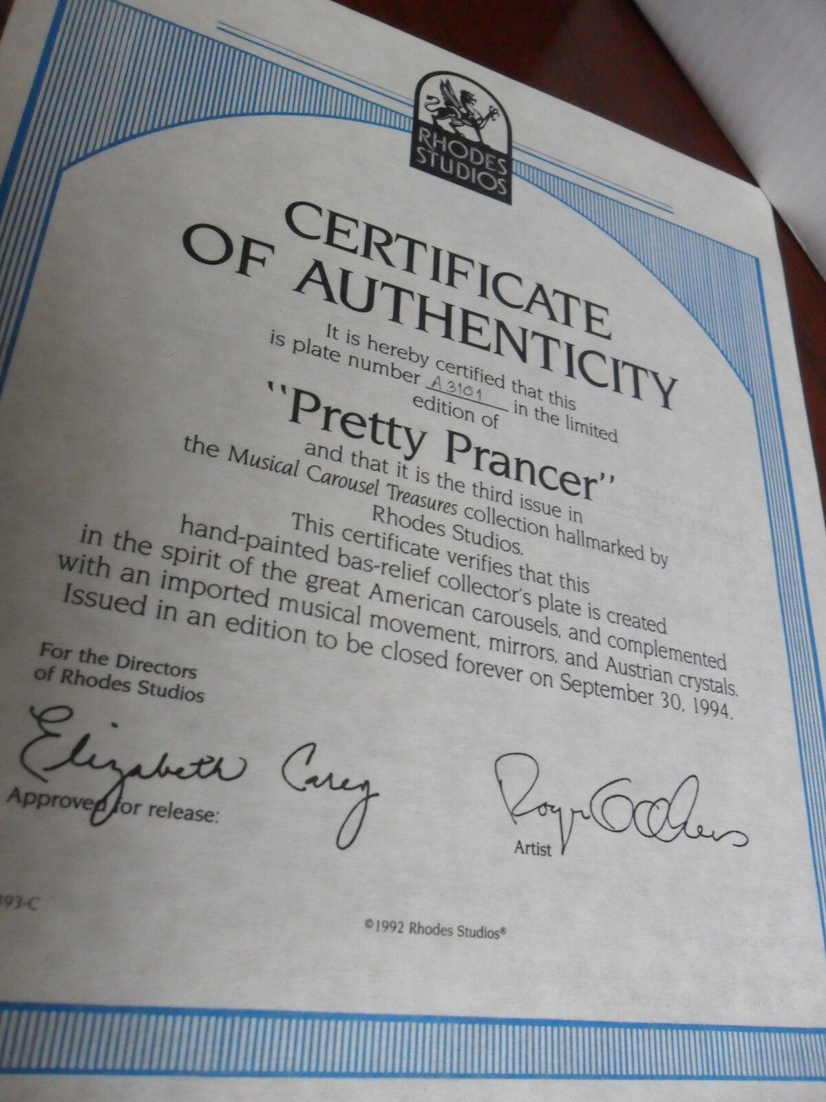 Pretty Prancer carousel horse musical plate, Rhodes Studio, 9" diam, very good condiiton in original box with certs