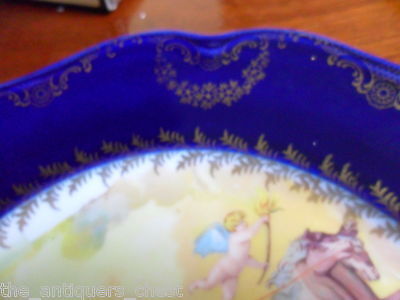 Sevres Guido Reni?s ?Aurora?, collector plate, cobalt blue and gold, signed, handpainted with mythological figures. Marked Sevres and there is a name under the impression "Madelaine". 10" diam. I could not find anything on this. "Aurora" was painted in about 1614, Casino dell'Aurora, Palazzo Pallavicini, Rome. This ceiling painting represents Apollo-Helios on the Chariot of the Sun Led by Aurora Followed by the Horae stands out in the mind of everyone who has visited the eternal city (Rome). It is painted on the ceiling of the garden house, or casino, of the Rospigliosi Palace. Though painted so long ago, yet it is as fresh in colouring as if its sportive creator had dipped his brush in yesterday morning?s sunlight, clear and bright, or in the barred purple and red and yellow of its gorgeous sunset. Certainly no other fresco of that now far-away time remains so perfectly preserved.