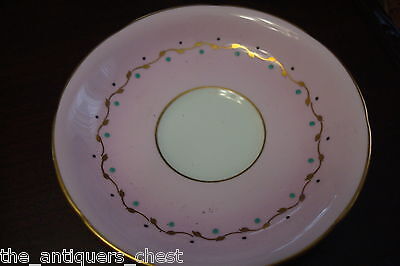 Royal Grafton England footed cup and saucer, pink and gold, cup is 2" tall by 3 3/4" diam and saucer is 5 1/2" very good condition, some light surface scratches commensurate with age