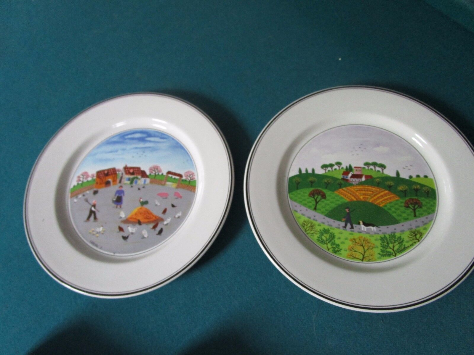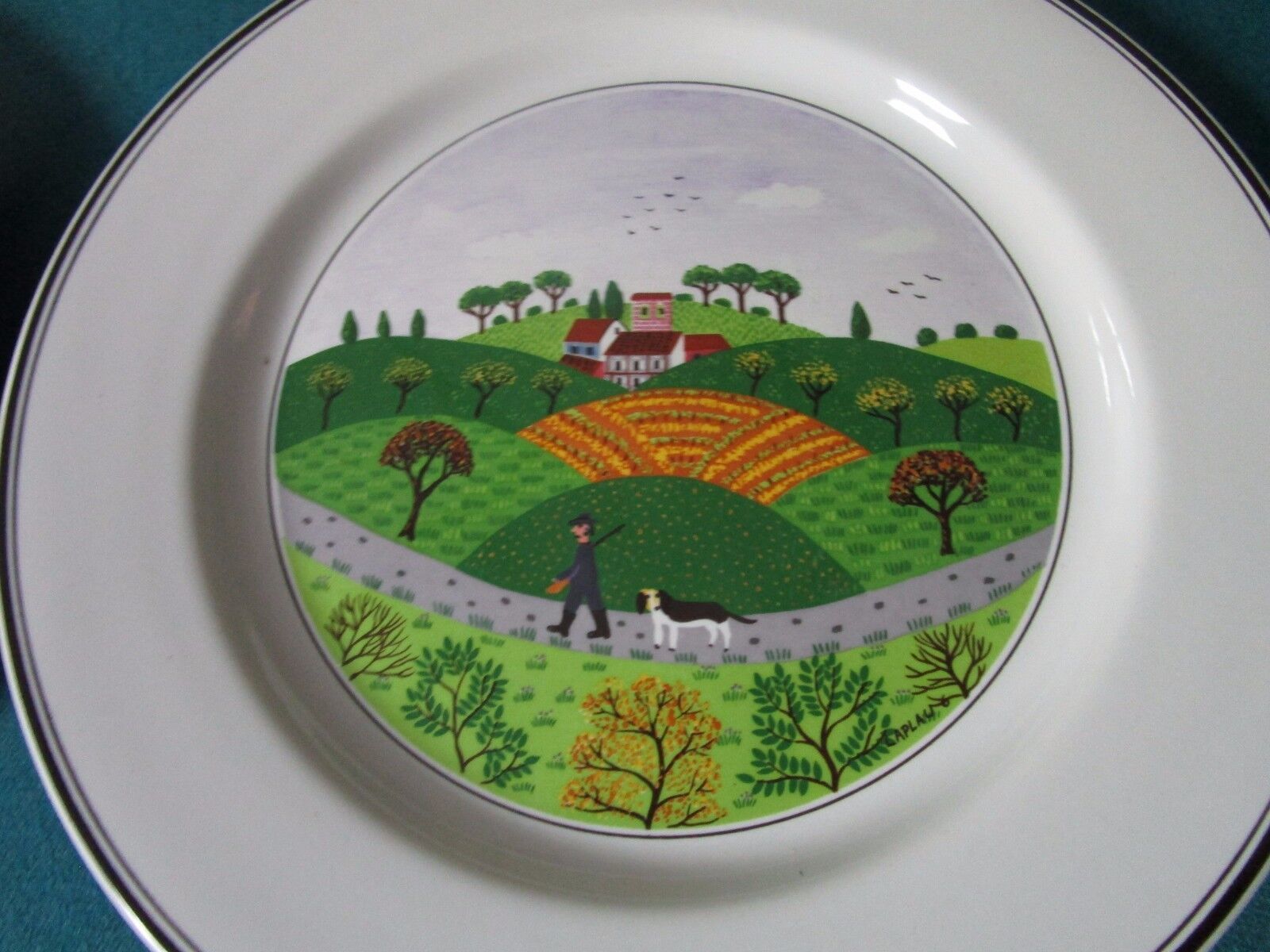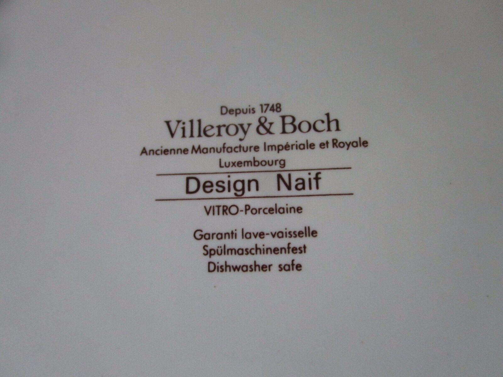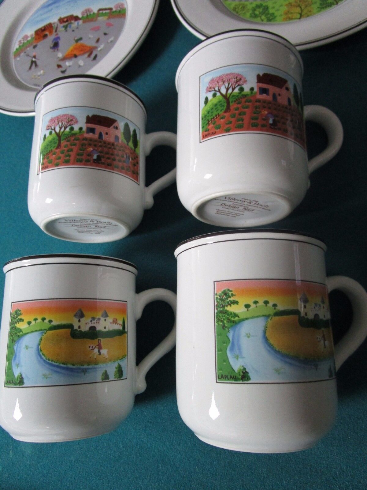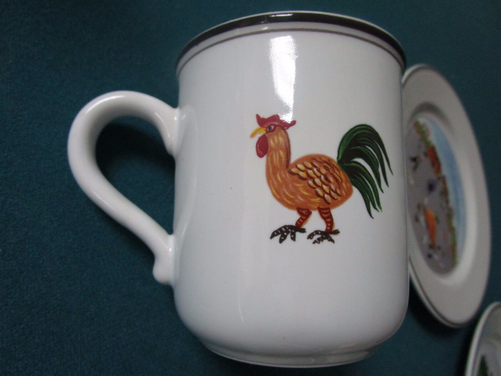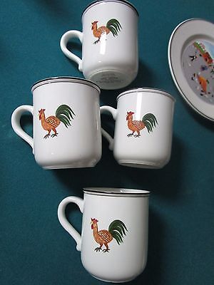 VILLEROY BOCH Design Naif 4 MUGS AND 1 DESSERT PLATE , 6 PIECES, PLATES ARE DESIGN #3 AND #6, FOUR MUGS WITH 2 DIFFERENT LAPLAU DESIGNS AND ROOSTERS DECOR, PLATE IS 8" AND MUGS ARE 3 1/2" TALL X 3 1/4" OPENING , VERY GOOD CONDITION 90BSKTRACK5