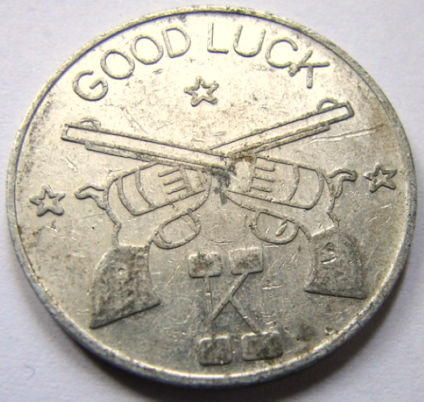 I am offering a vintage 1950's Knott's Berry Farm Buena Park Calf California CA Good Luck Souvenir with Pistols Coin Medal Token.