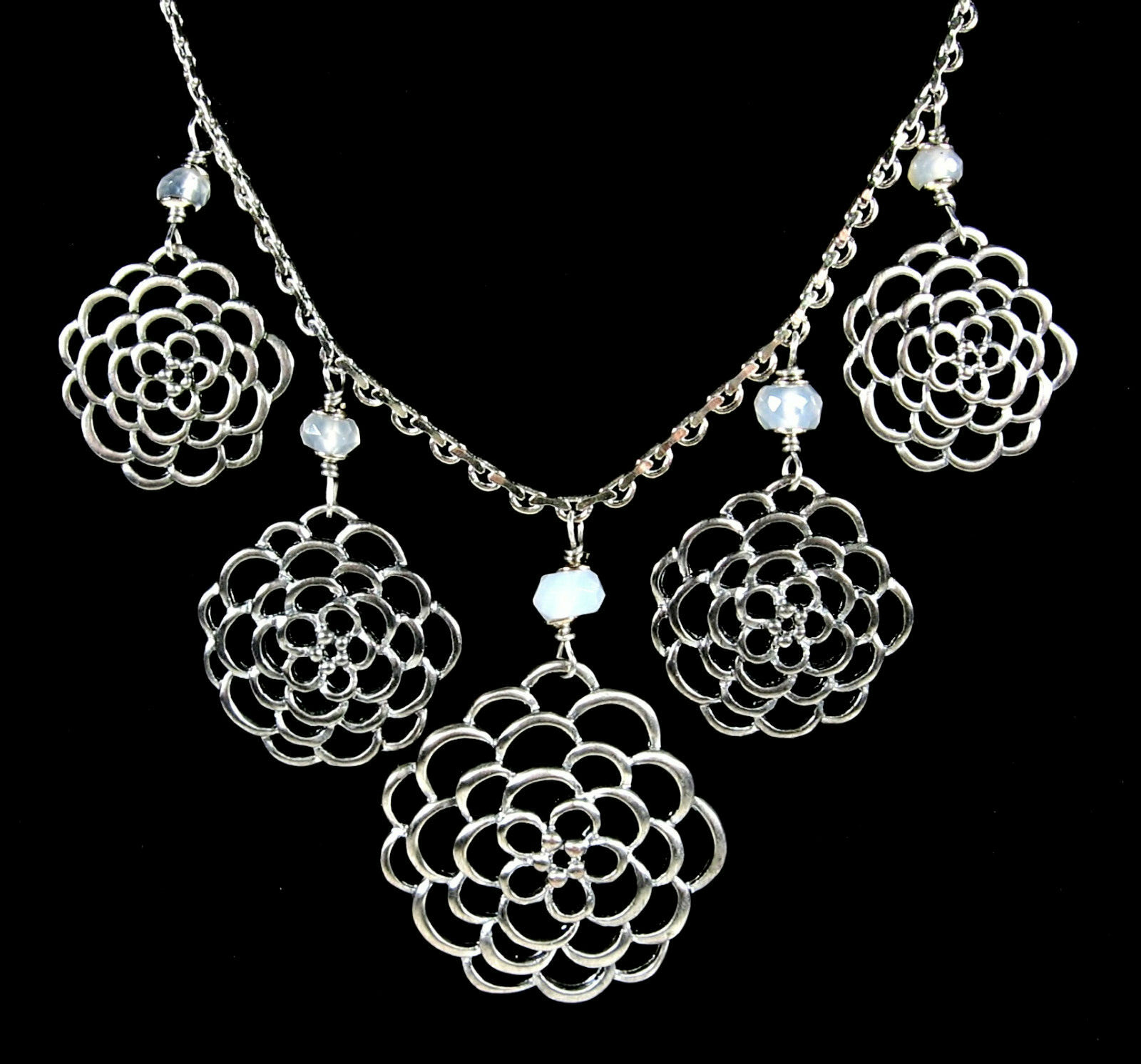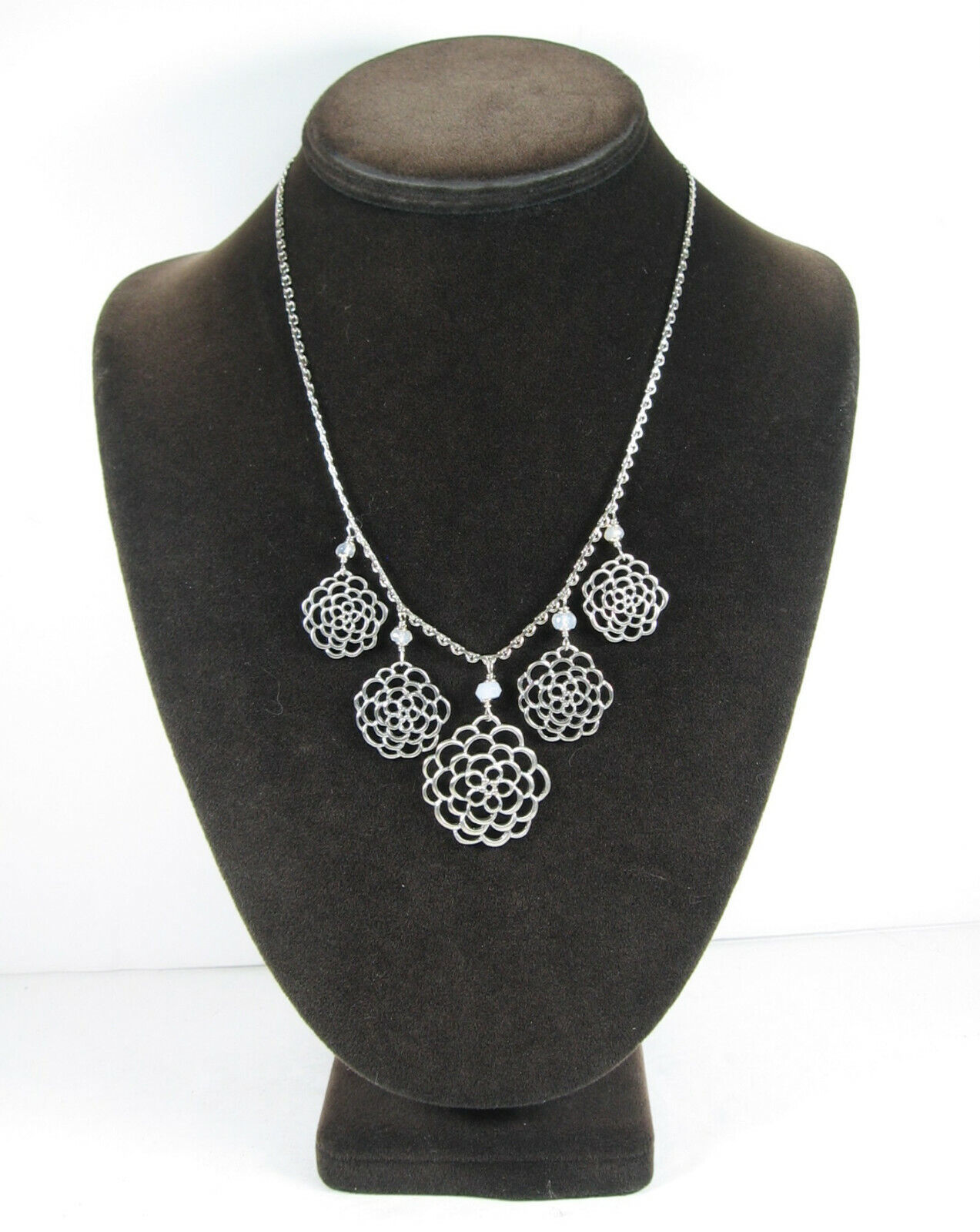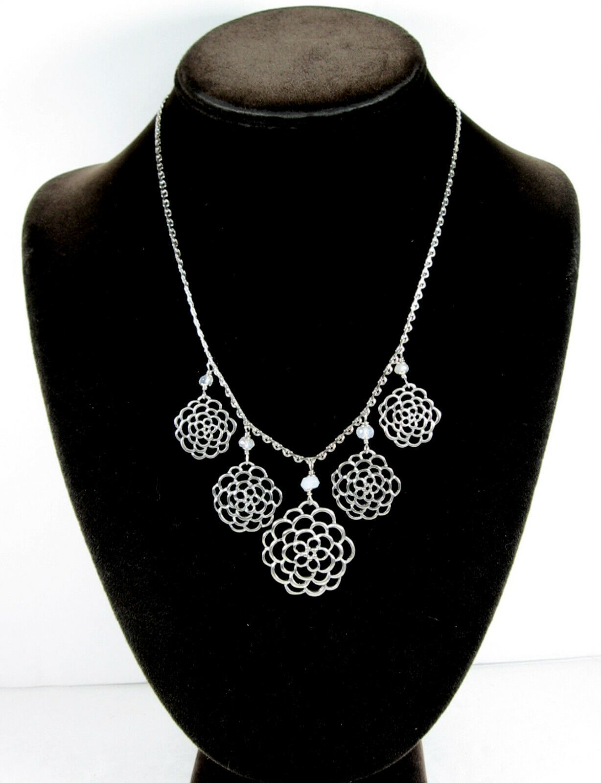 In a silvertone metal the necklace has a front piece that as 5 dangling FLOWER BLOOM PENDANTS! Each with a milky glass round bead above it.