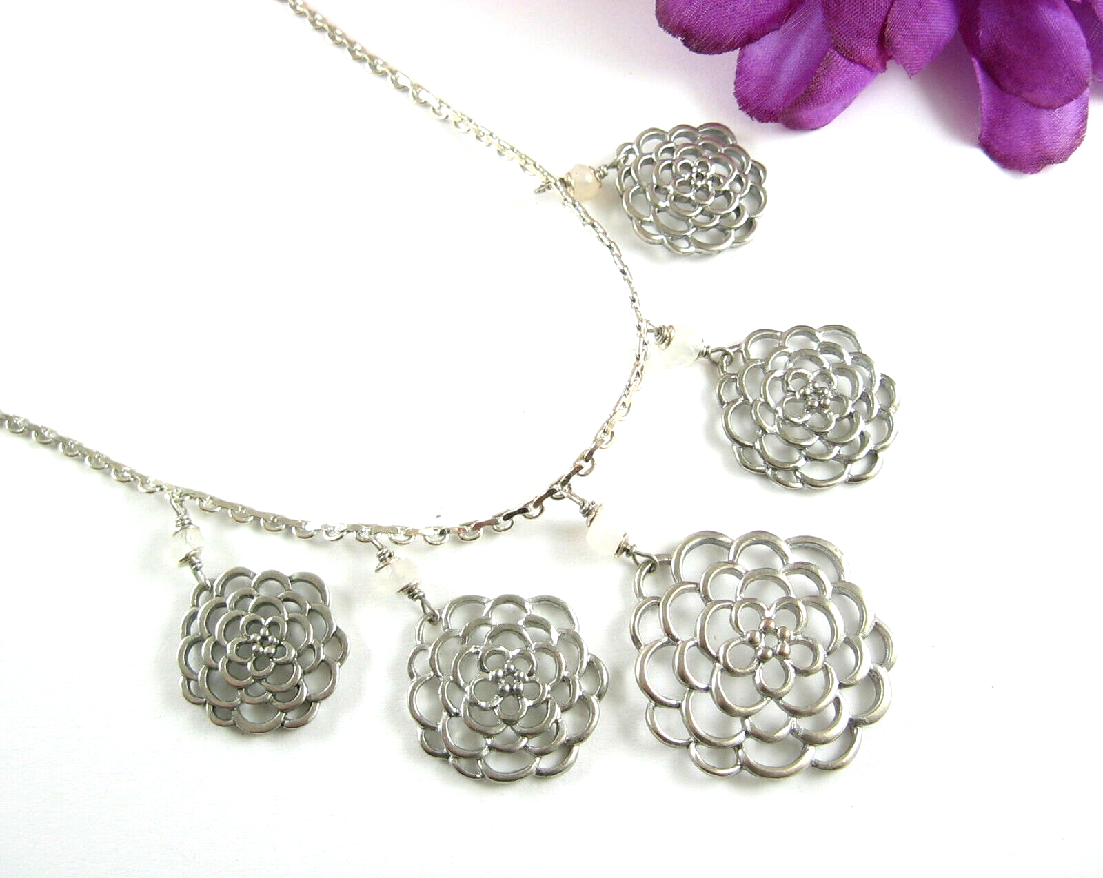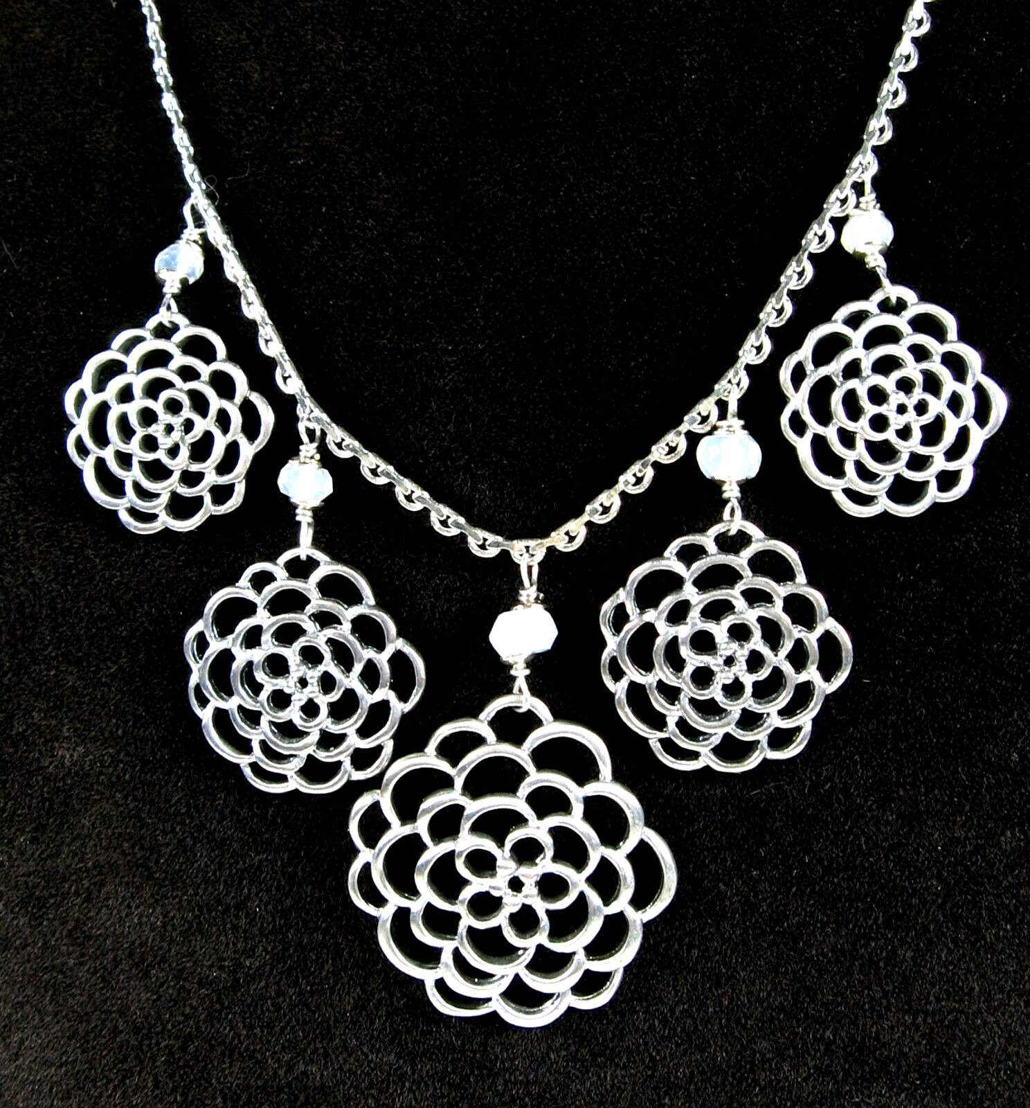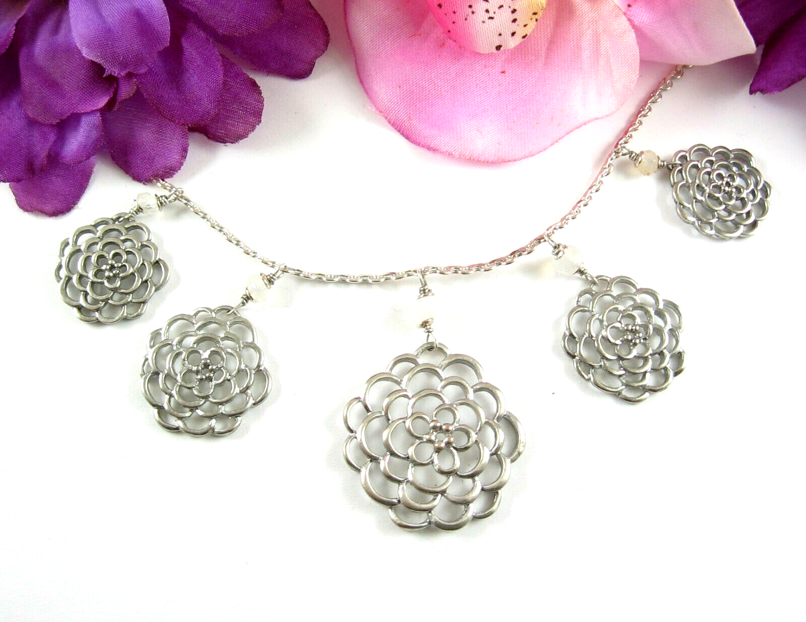 In a silvertone metal the necklace has a front piece that as 5 dangling FLOWER BLOOM PENDANTS! Each with a milky glass round bead above it.
