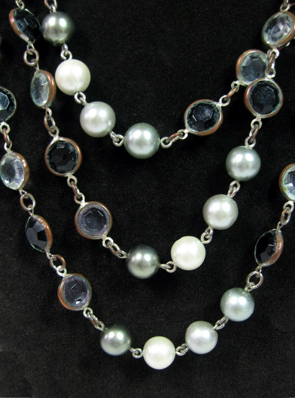 There are many different beads along the length. There is a group of 4 "Faux Pearl" style beads, one is white and the other three are in shades of gray.