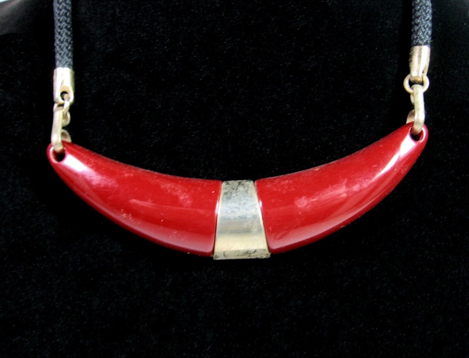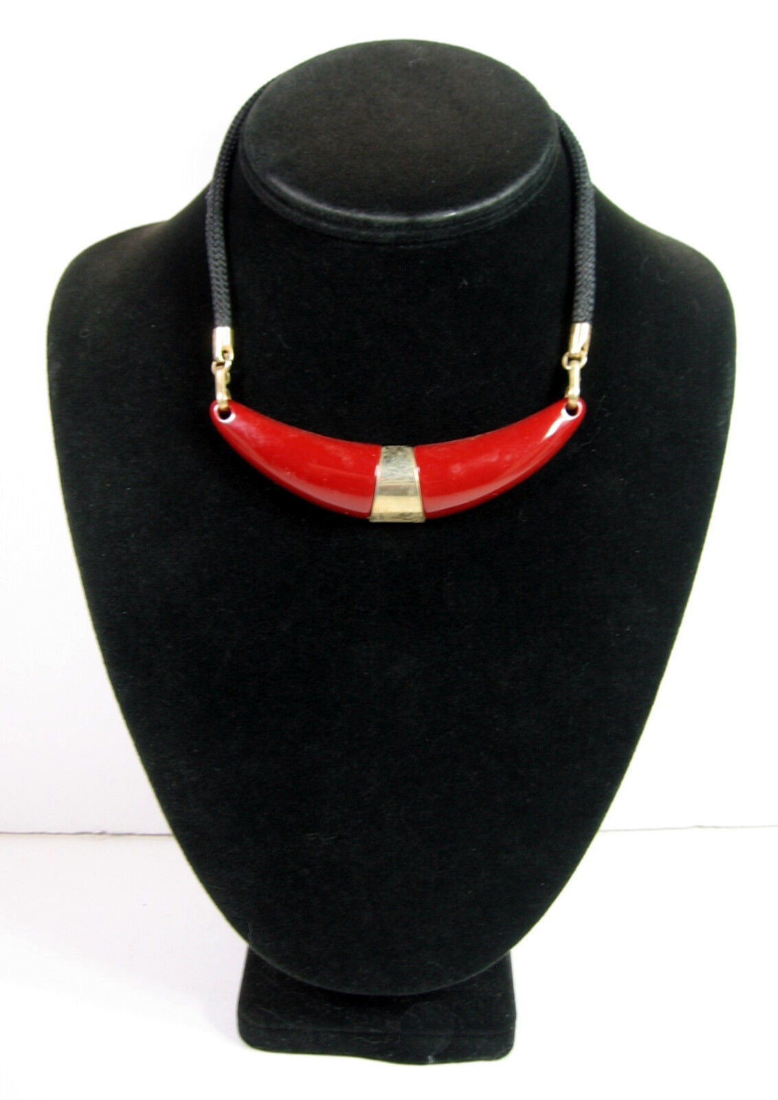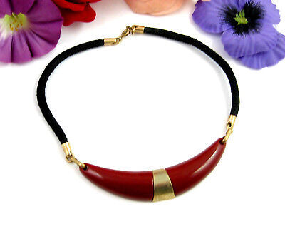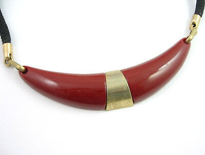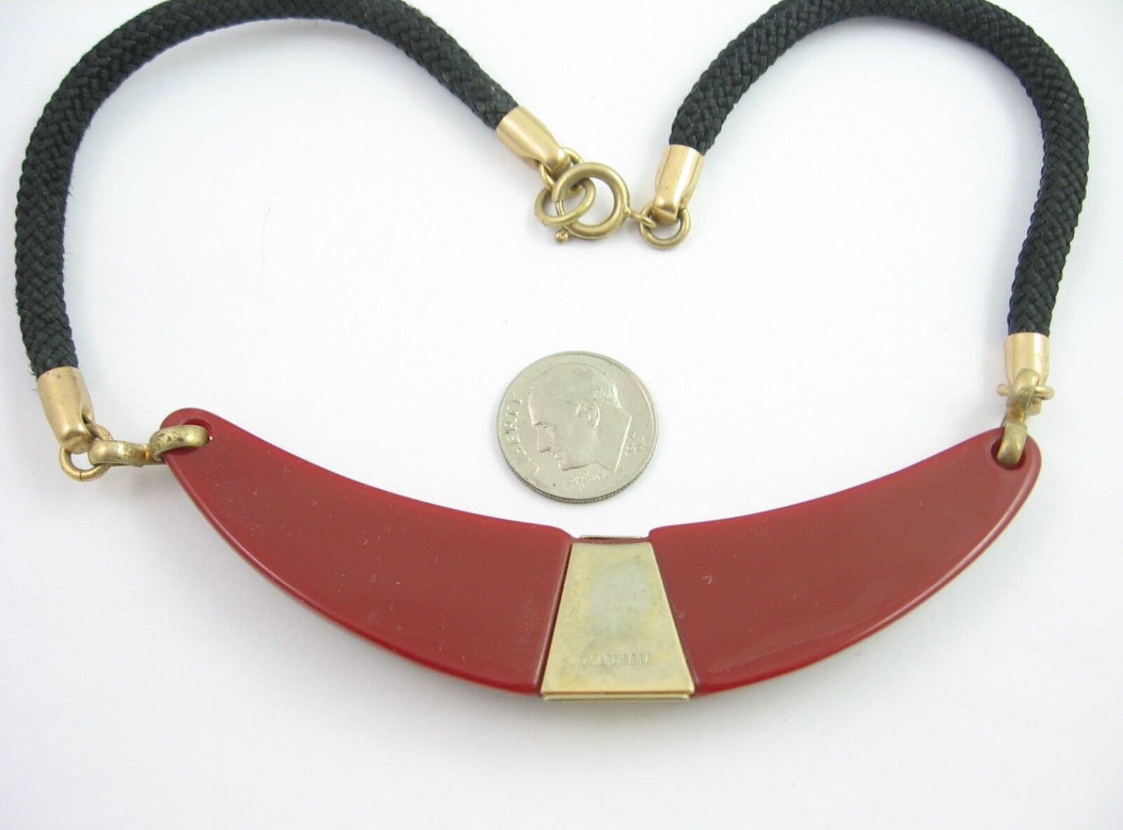 With goldtone metal accents and clasp, this vintage black cord SARAH COVENTRY Necklace has a RUSTY RED BROWN Plastic FRONT PIECE.
