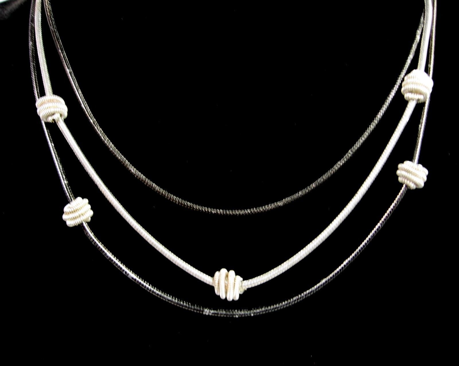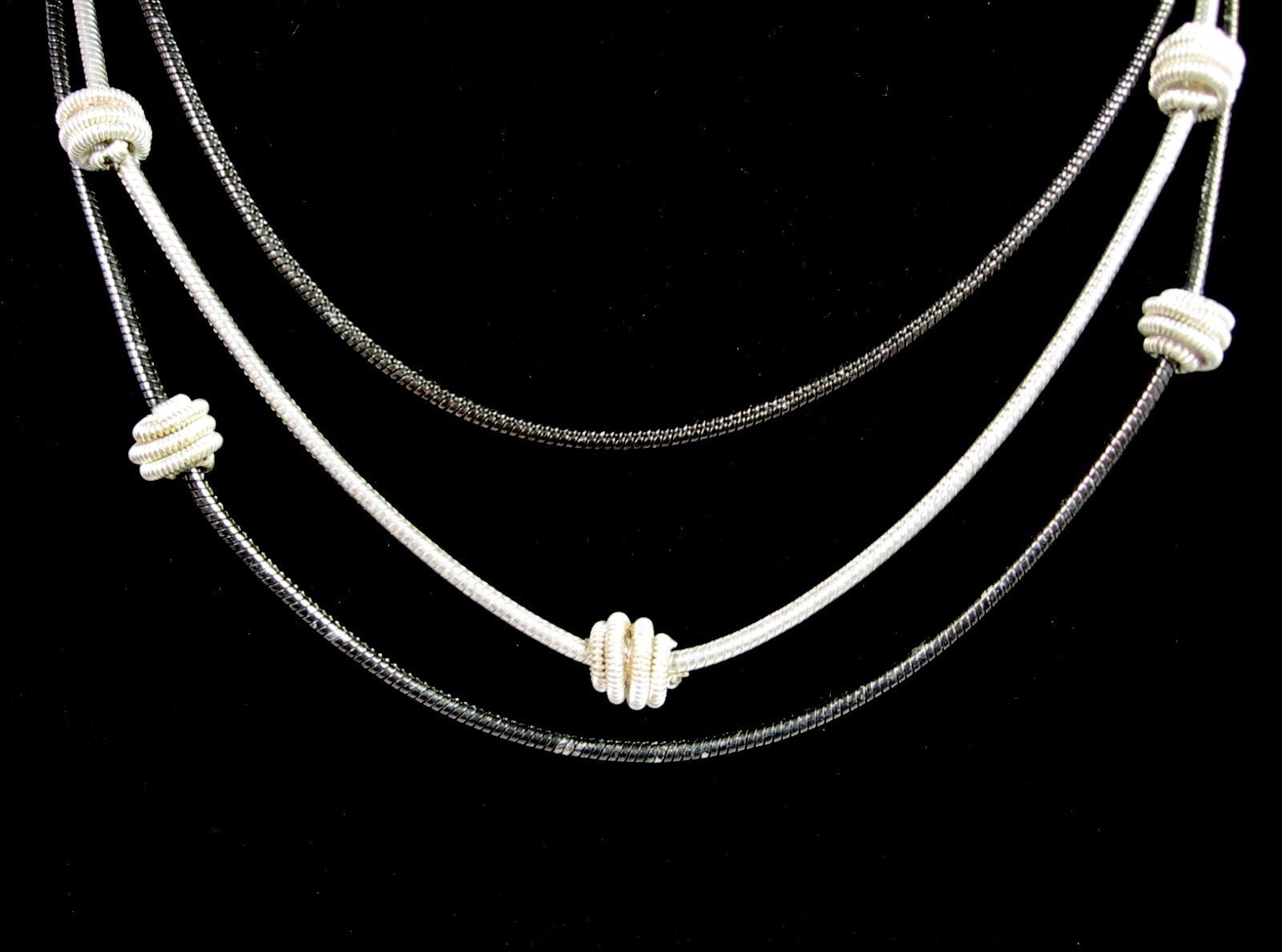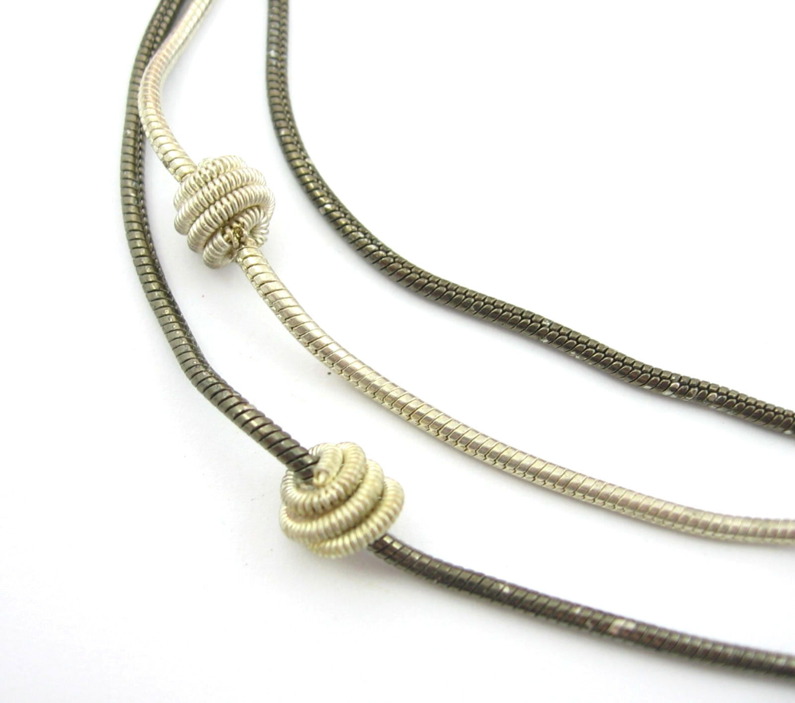The necklace has the three strands; two in the gunmetal gray color and one in a silvertone. The silvertone and one of the gunmetal gray have a few silvertone "Knots" along the length.