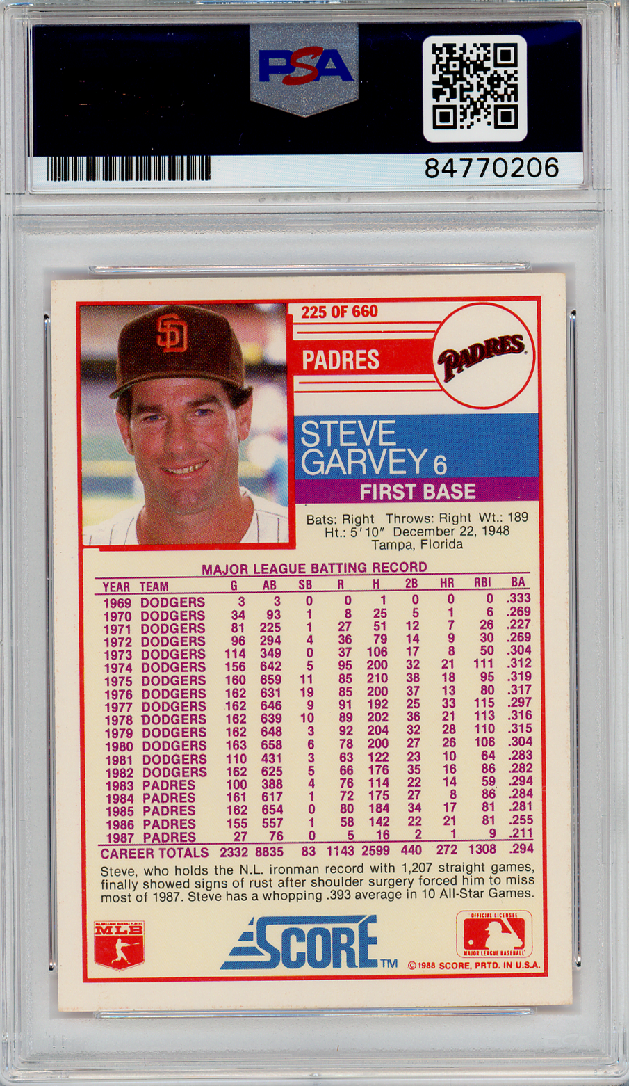 1988 Score #6 Steve Garvey Signed COA PSA 8 San Diego Padres