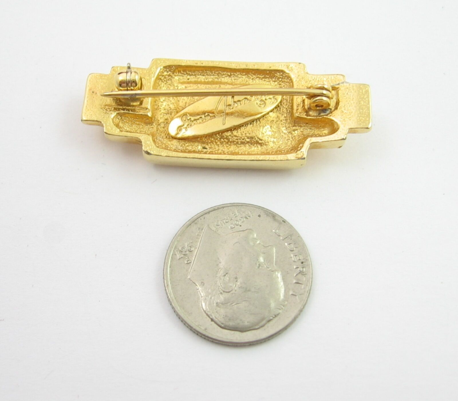 Vintage GINNIE JOHANSEN Black ENAMEL SQUARES Vintage PIN Art Deco Style Goldtone 1 3/8"