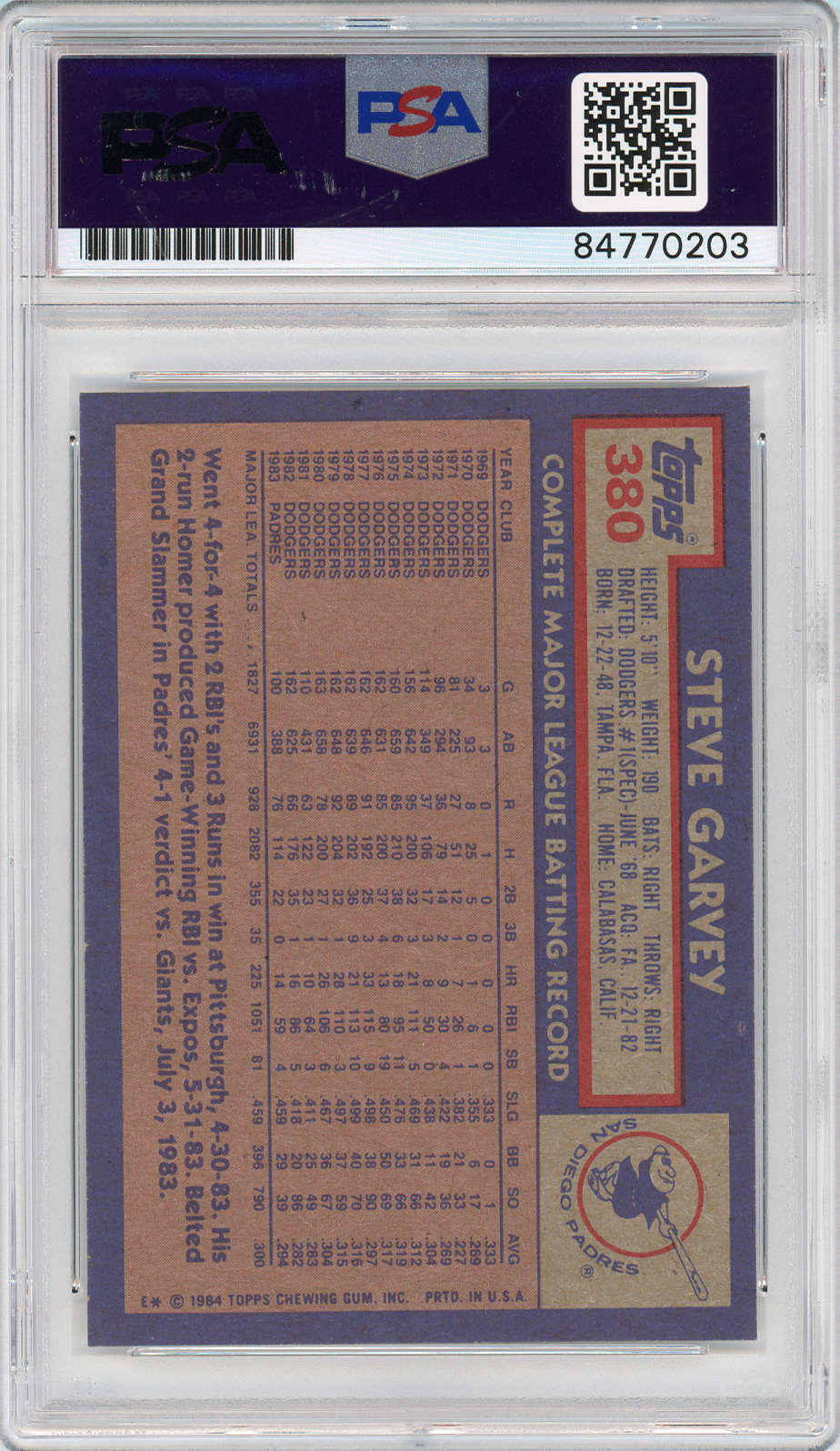 1984 Topps Steve Garvey Signed COA PSA 10 San Diego Padres Slabbed Autograph