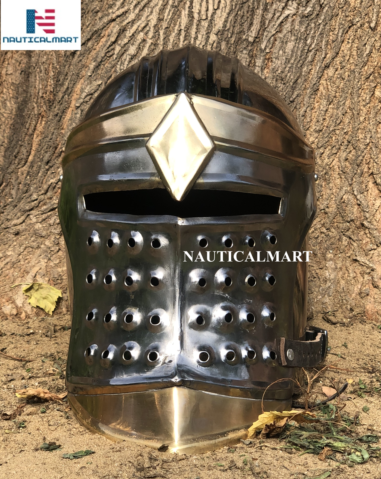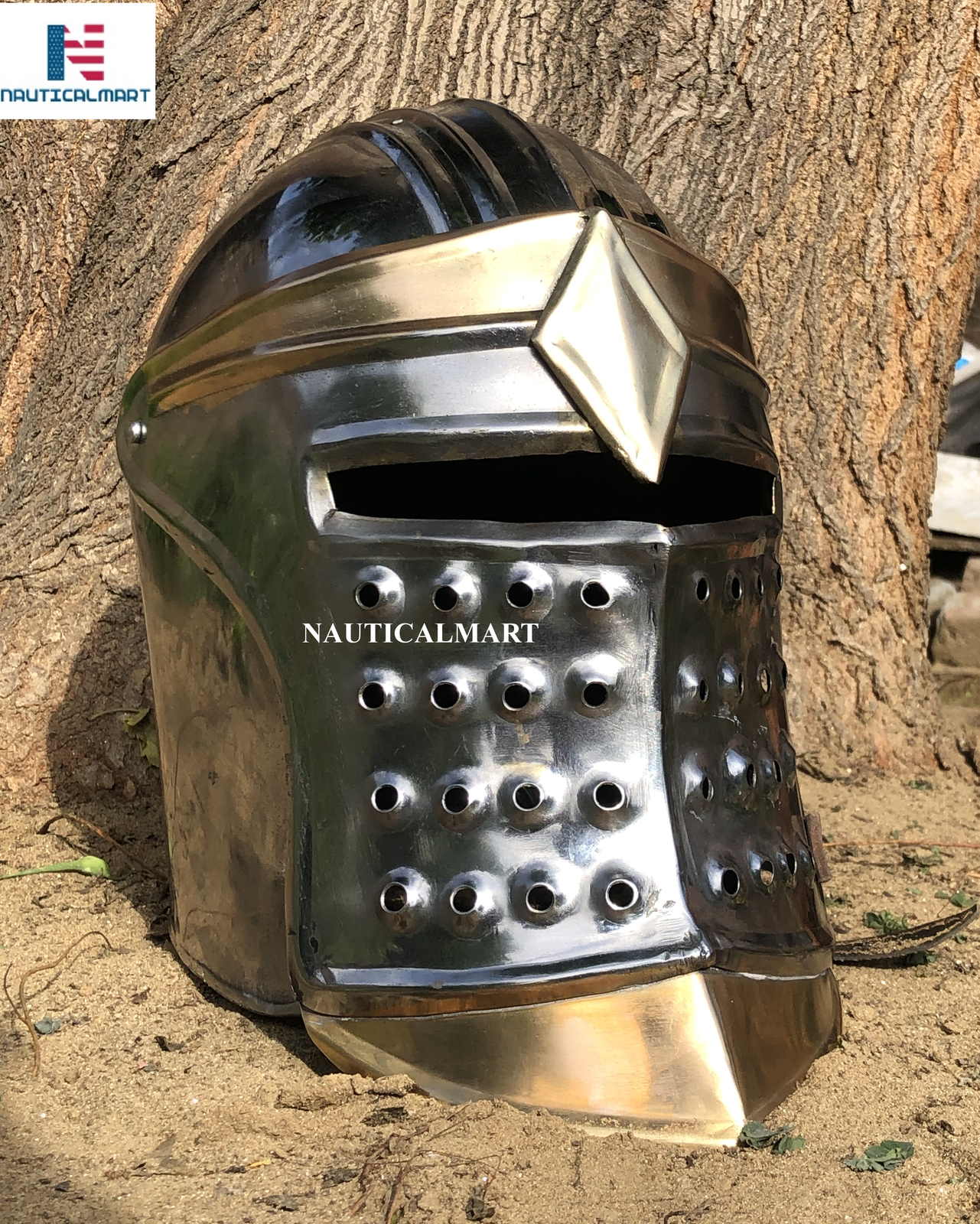 Ideal decoration helmet/collectible helmet with a range of uses like renaissance events, reenactments, LARP events historical societies and a costume for any holiday occasion. We crafted this helmet from Iron Steel Metal have black color inside to ensure it is a true representation of a medieval fighting man.