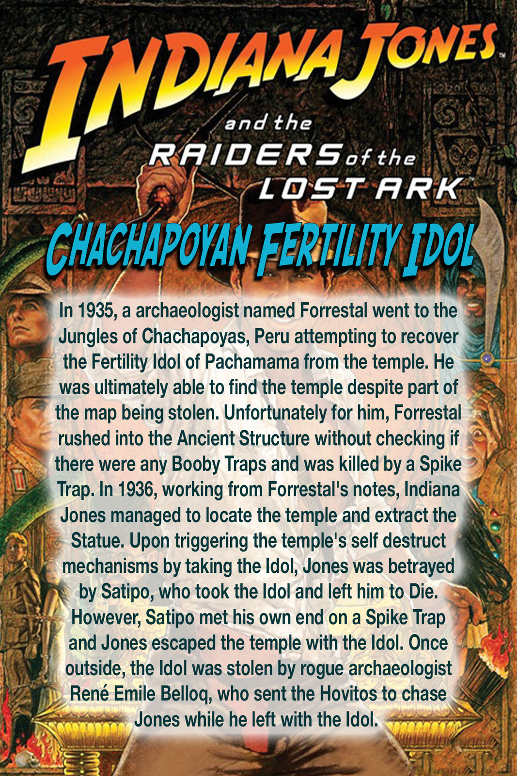 In 1936, American Archaeologist Indiana Jones Braves an Ancient Booby-Trapped Temple in Peru to retrieve The Golden Idol of Fertility. He is confronted by rival Archaeologist Rene Belloq and the Indigenous Hovito people. Surrounded and Outnumbered, Jones is forced to surrender the Famous Idol to Belloq and escapes aboard a waiting Water Plane.