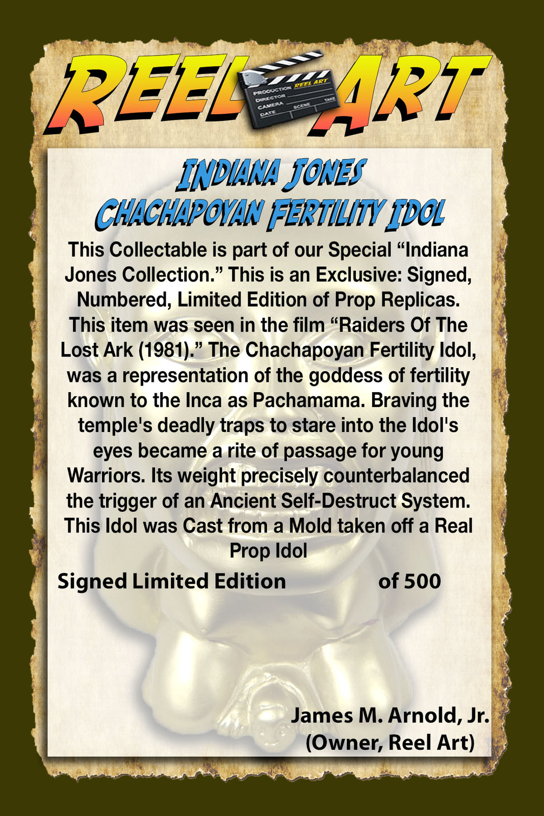 This Collectable is part of our Special "Indiana Jones Collection." This is an Exclusive: Signed, Numbered, Limited Edition of Prop Replicas. This item is a Golden Idol of Fertility Idol as seen in the Famous Film "Raiders of the Lost Ark (1981)" Starring: Harrison Ford, Screenplay by: George Lucas and Directed by: Steven Spielberg. This Movie Prop Replica was Cast from a Mold that was made Directly from a Real Prop that was used in the Film. This Original Prop used in the Molding process was Obtained Directly from Elstree Studios. They made all of the Props that were seen in the Film. The Original Props, were originally Inspired by Inca and Pre-Columbian Art. The Female Figure was Designed with a Horrific Countenance to Heighten the Suspense as Indiana Jones Approached the Golden Relic. Each item comes complete with a 4 x 6 Inch Full Color, Professionally Printed, Certification Card that has Poster Art from film and also explains the role of the Idol in the film.