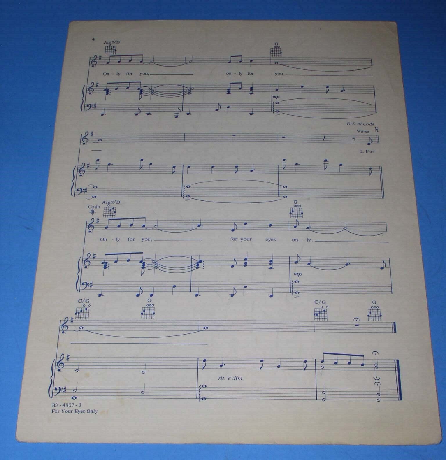 This is the vintage sheet music for the Sheena Easton song, "For Your Eyes Only". Dated 1981 Danjaq S.A. A terrific item for the fan or collector.