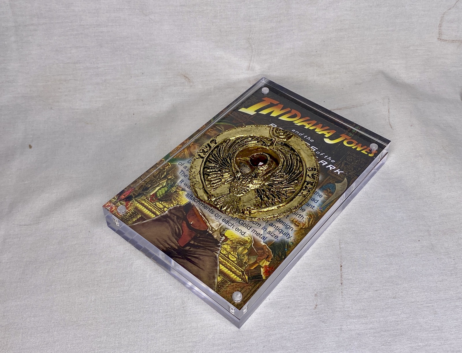 This Item is a Very Detailed Real Prop Replica of the Famous Indiana Jones Staff Of RA Headpiece. The Object Measures: 3 inches in Diameter and .25 Thick and has Two Acrylic Amber Jewels Attached to the Eyes. Both Jewels are Completely Transparent so you can Shine a Light through to Reveal the Location of the Lost Ark! It is Solid Metal, Gold Plated, then Artistically Antiqued with a Screen Accurate Finish that makes this Prized Collectable Appear Just Like the Real Prop.