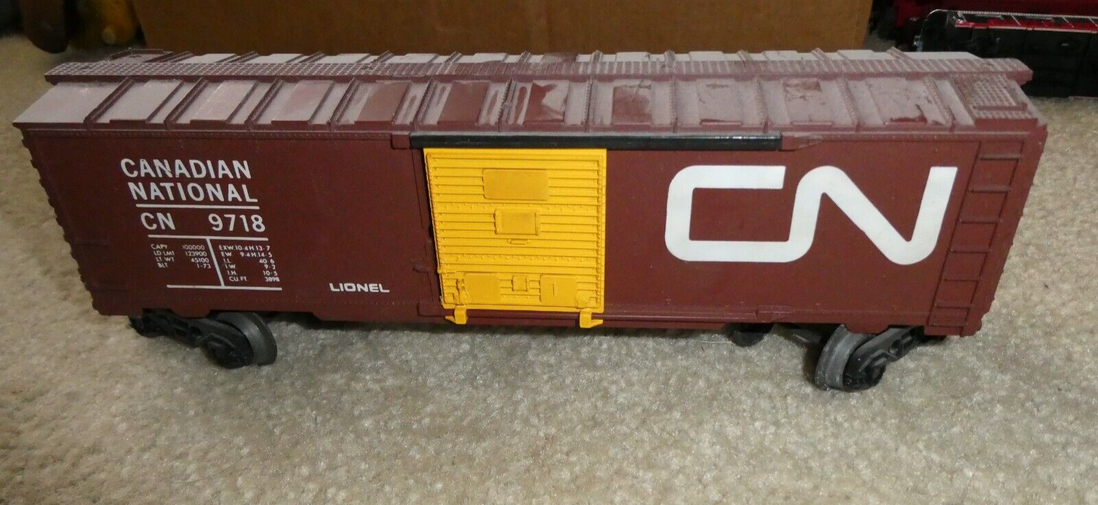 You are bidding on a nice looking, 1970s, O scale, Lionel Canadian National CN 9718 box car in the pictures. 9 1/2 inches long. Very good shape with little wear but needs a good cleaning or leave as shown. Zoom in for details.