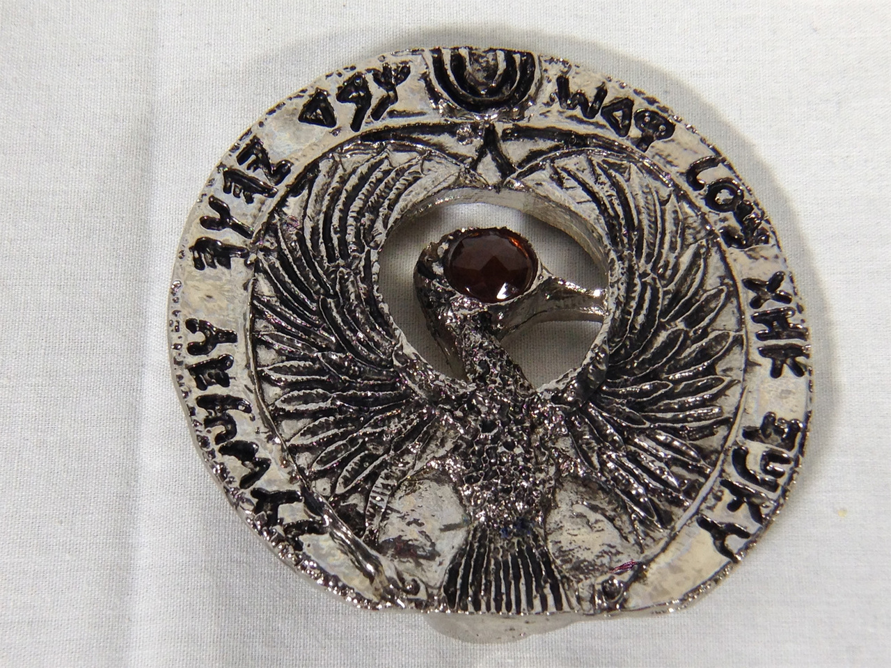 This Item is a Very Detailed Real Prop Replica of the Famous Toht German Indiana Jones Staff Of RA Headpiece. The Object Measures: 3 inches in Diameter and .25 Thick and has Two Acrylic Amber Jewels Attached to the Eyes. Both Jewels are Completely Transparent so you can Shine a Light through to Reveal the Location of the Lost Ark! The reverse side of the Headpiece is embossed with a German stamp showing an Eagle on circle and stock number. It is Solid Metal, Silver Plated, then Artistically Antiqued with a Screen Accurate Finish that makes this Prized Collectable Appear Just Like the Real Prop.
