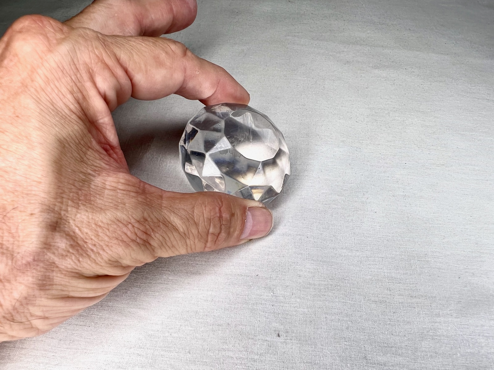 This Real Prop Replica of the Diamond is made out of Crystal Clear Acrylic and measures; 2 inches in diameter x 1 inch thick. The Diamond has over 100 facets on it and is convex with a 7/8 inch diameter flat circle on top. The bottom of Diamond is also flat.