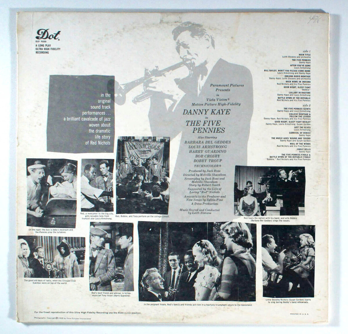 The Five Pennies, by Louis Armstrong and Danny Kaye, was the soundtrack for the semi-biographical musical film of the same name. Showcasing Kaye as jazz cornet player and bandleader Loring Red Nichols, other cast members include Barbara Bel Geddes, Louis Armstrong, Harry Guardino, Bob Crosby, Bobby Troup, Susan Gordon, and Tuesday Weld. The film was directed by Melville Shavelson. The real Red Nichols recorded all of Kaye's cornet playing for the film soundtrack. The film received four Oscar nominations for Best Musical Scoring, Best Original Song, Best Cinematography, and Best Costumes.