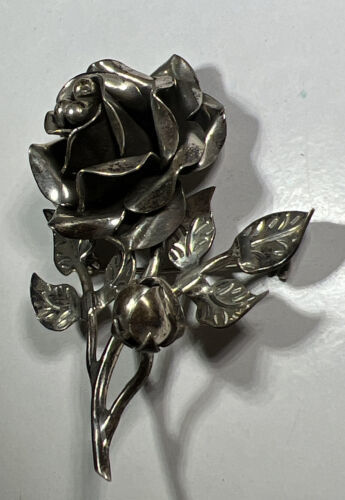 Wonderful taxco sterling silver brooch. This rose is beautifully crafted and tagged by maker TC-160. The pin measures about two inches across and 2.5 inches long.