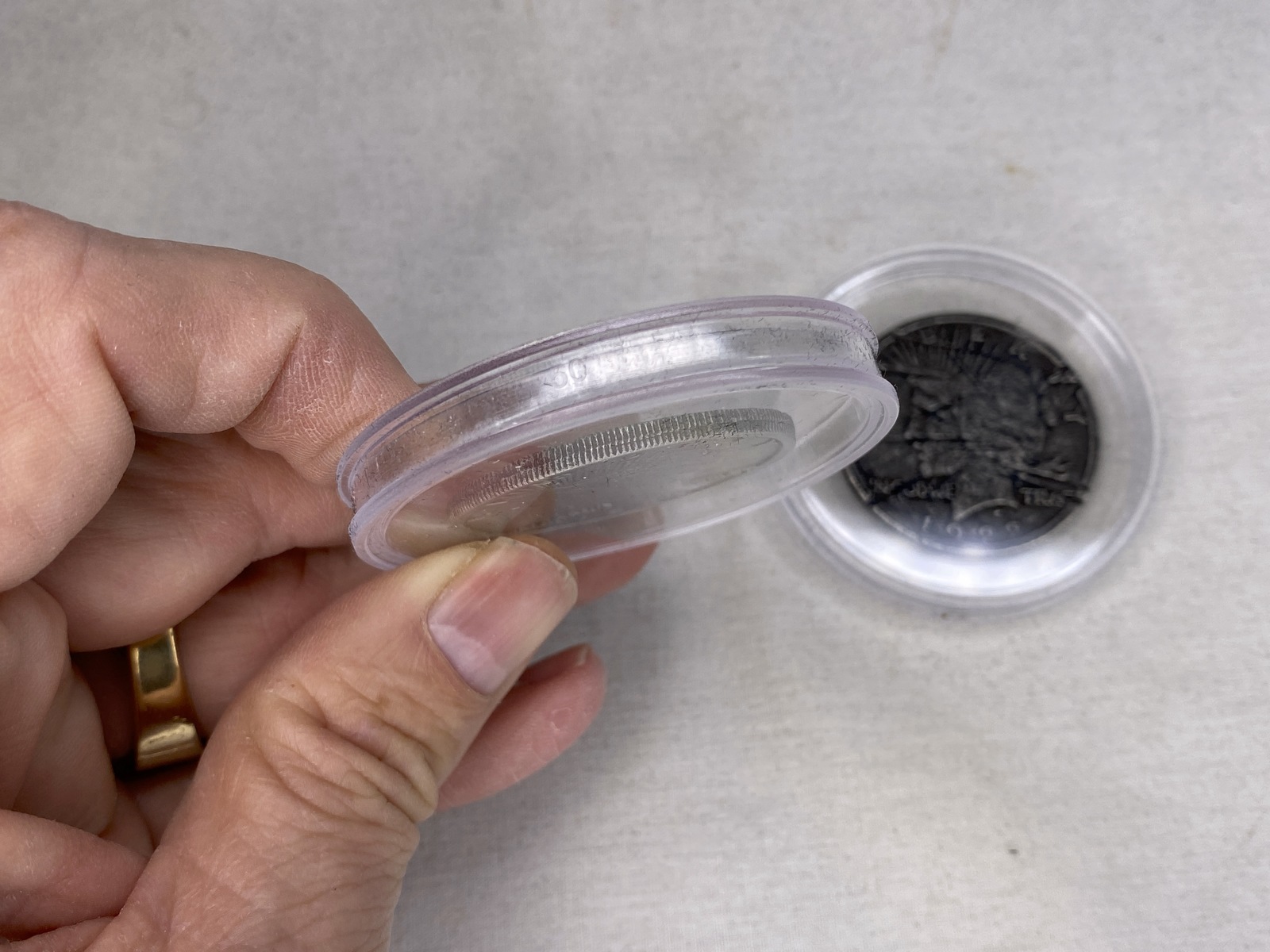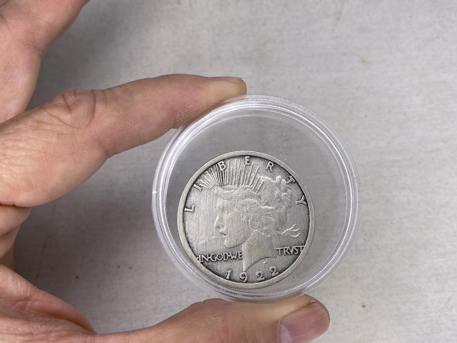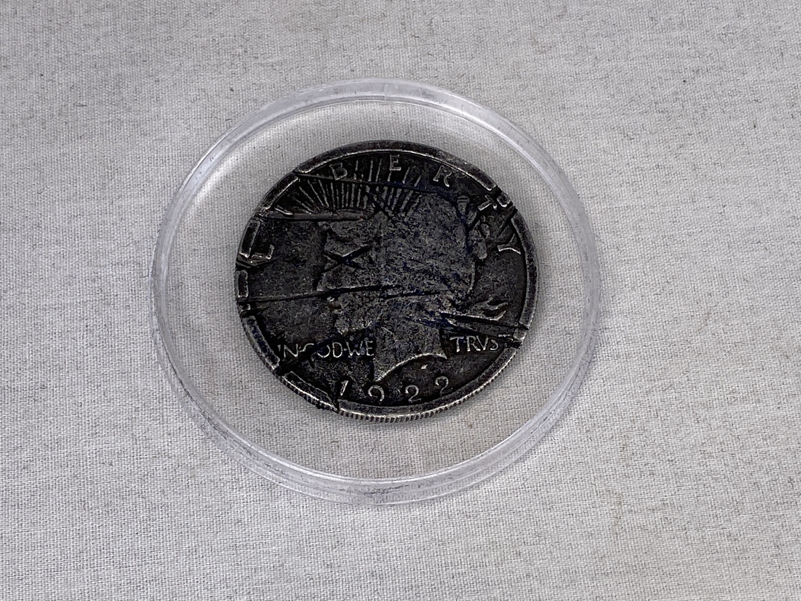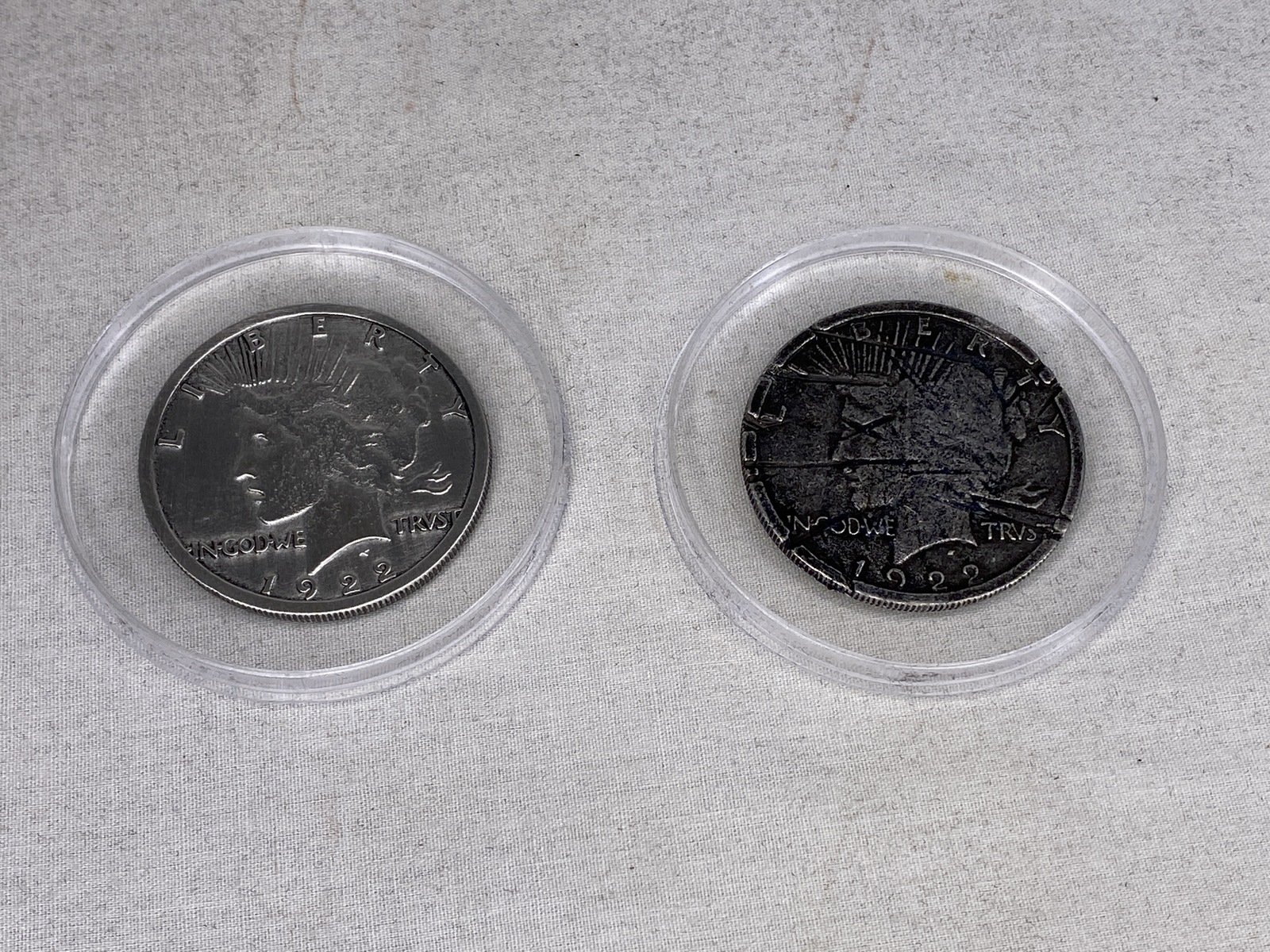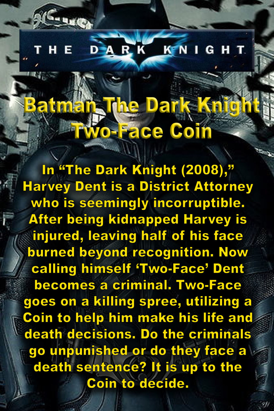 The Two Face Coin Resembles the Real Prop Coin that Two-Faced Flipped in the film. The Coin in Film was made from a 1922 Liberty Dollar type Coin. This Coin has the Liberty Head on both sides. On one side it is Shiny and Perfect but on the other side it is Dirty and Scratched. So is this one, It is also a 1922 Liberty Dollar Type Coin Shiny on one side and Scratched on the Reverse. They are the same size as a Real Liberty Dollar.