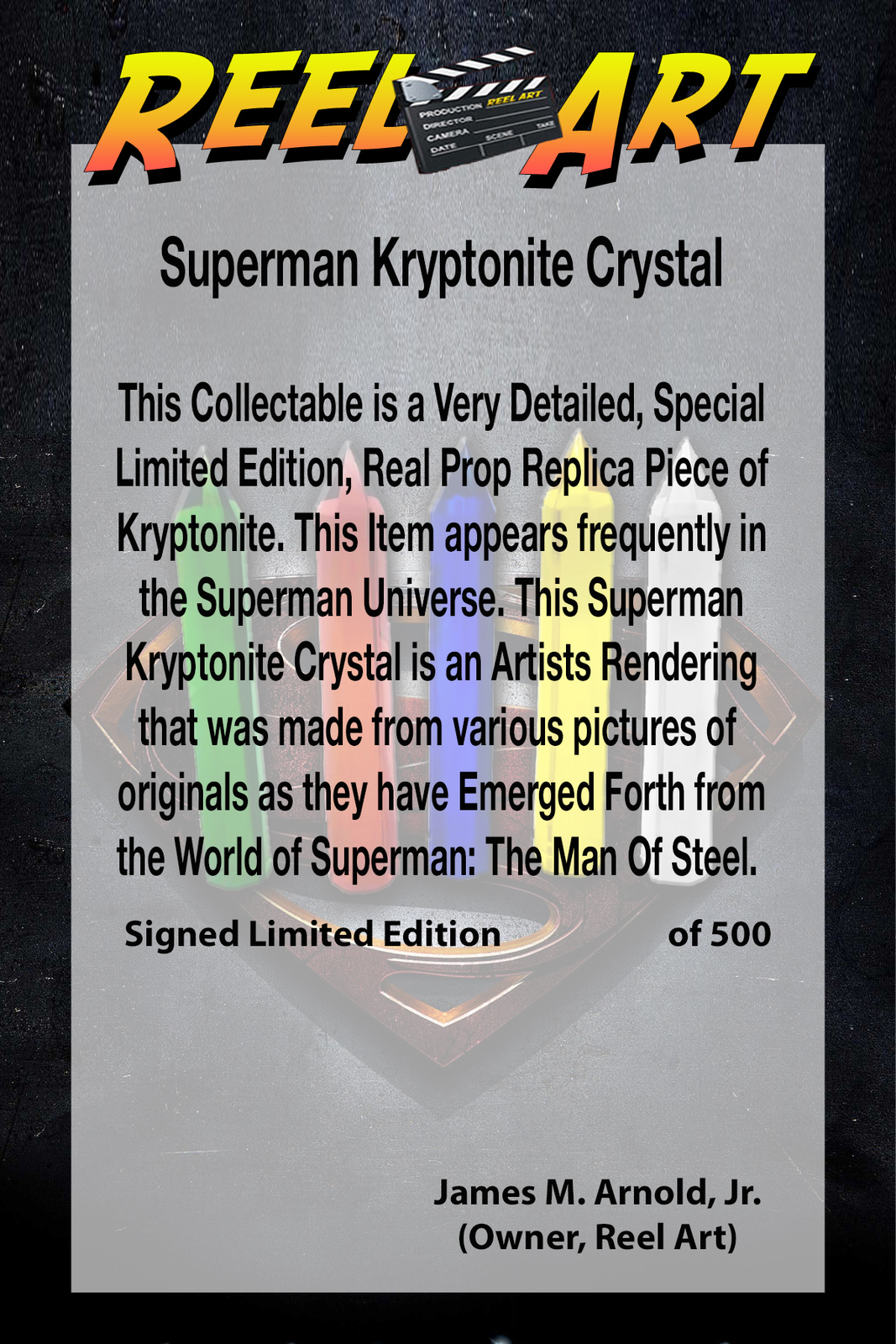 This Superman Collectable is a Very Detailed, Exclusive, Signed, Numbered, Limited Edition, Real Prop Replica Piece of Red Kryptonite. This Item appears frequently in the Superman Universe. This Superman Kryptonite Crystal is an Artists Rendering that was made from various pictures of originals as they have Emerged Forth from the World of Superman: The Man Of Steel. Each Kryptonite Crystal Item Comes Complete with a Double Sided, 4 x 6 inch, Full Color, Professionally Printed, Certification Card. This Documentation contains Poster Art and Explains in Detail about Superman Kryptonite and how it is used in the Superman Universe.