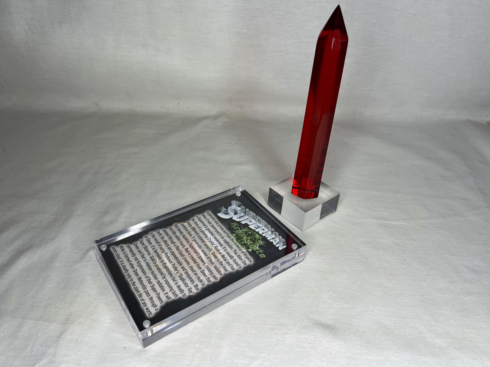Superman Kryptonite, Red Acrylic Crystal, Real Prop Replica, Plaque, Item Stand
