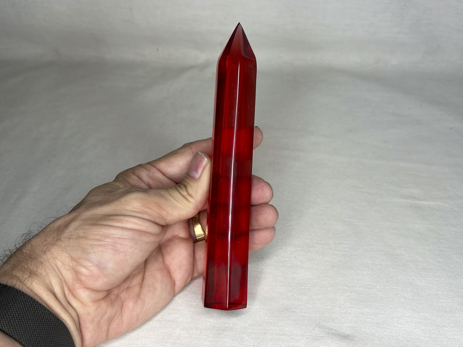 The Superman Kryptonite Crystal is Six Sided, Flat on the Bottom, and Tapers Down to a Point 1 inch from the Top. Each Real Prop Replica is made out of Translucent Solid Colored Acrylic and measures: 7 inches tall x 1 inch in diameter at base.