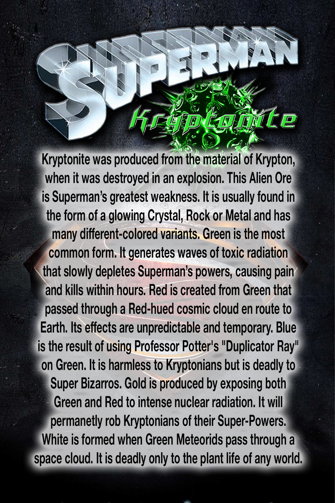 Kryptonite was produced from the material of Krypton, when it was destroyed in an explosion. This Alien Ore is Superman?s greatest weakness. It is usually found in the form of a Glowing Crystal, Rock or Metal and has many different-colored variants. Green is the most common form. It generates waves of toxic radiation that slowly depletes Superman?s Powers, causing pain and kills within hours. Red is created from Green that passed through a Red-Hued Cosmic Cloud en route to Earth. Its effects are unpredictable and temporary. Blue is the result of using Professor Potter's "Duplicator Ray" on Green. It is harmless to Kryptonians but is deadly to Super Bizarros. Gold is produced by exposing both Green and Red to intense Nuclear Radiation. It will permanently rob Kryptonians of their Super-Powers. Clear is formed when Green Meteorids pass through a Space Cloud. It is deadly only to the plant life of any world.