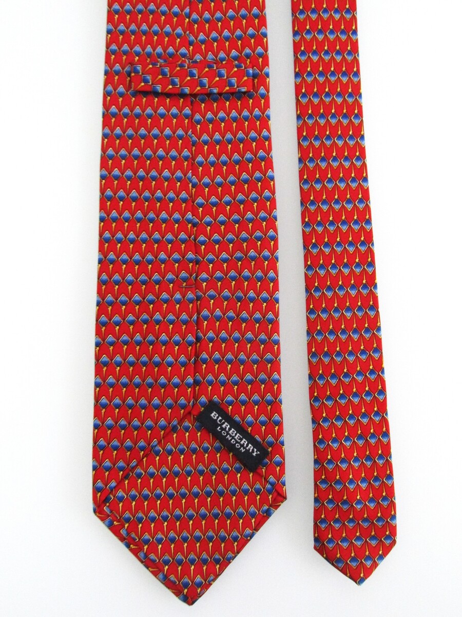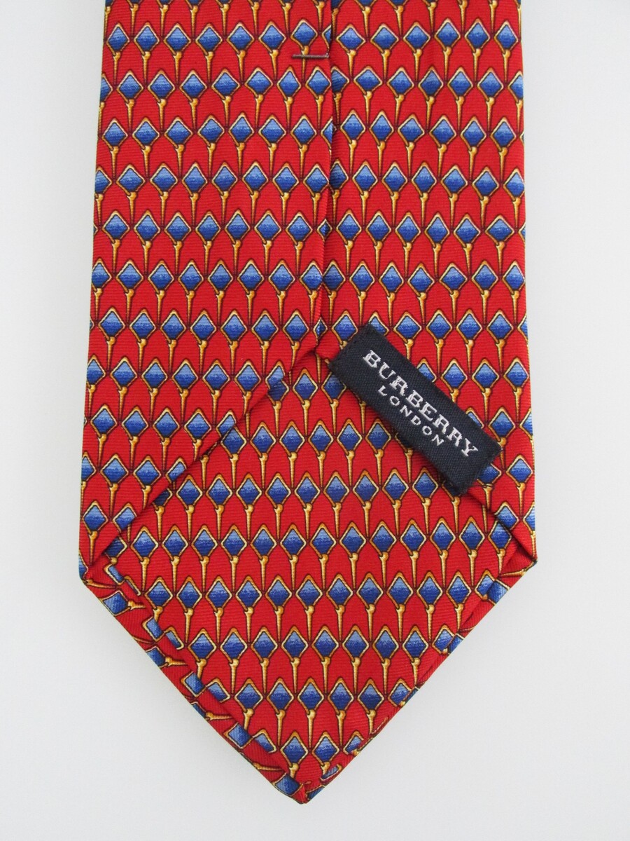 Description: Up for sale is a Burberry men's designer silk tie. The tie is handmade in France of 100% silk. The tie has a contemporary pattern in blue gold on a red background. Dimensions are approximately 59" long x 3.50" wide. This tie is in excellent condition.