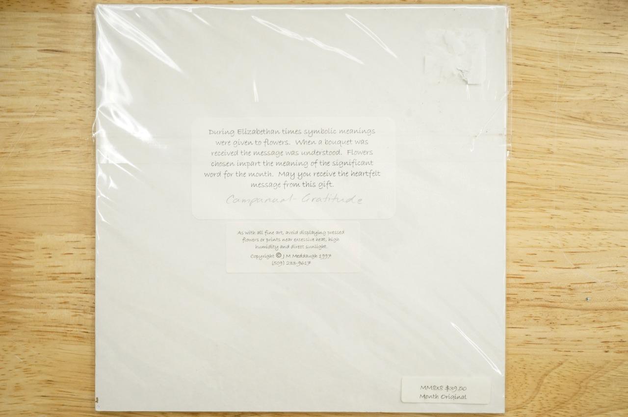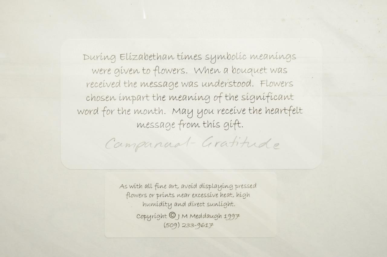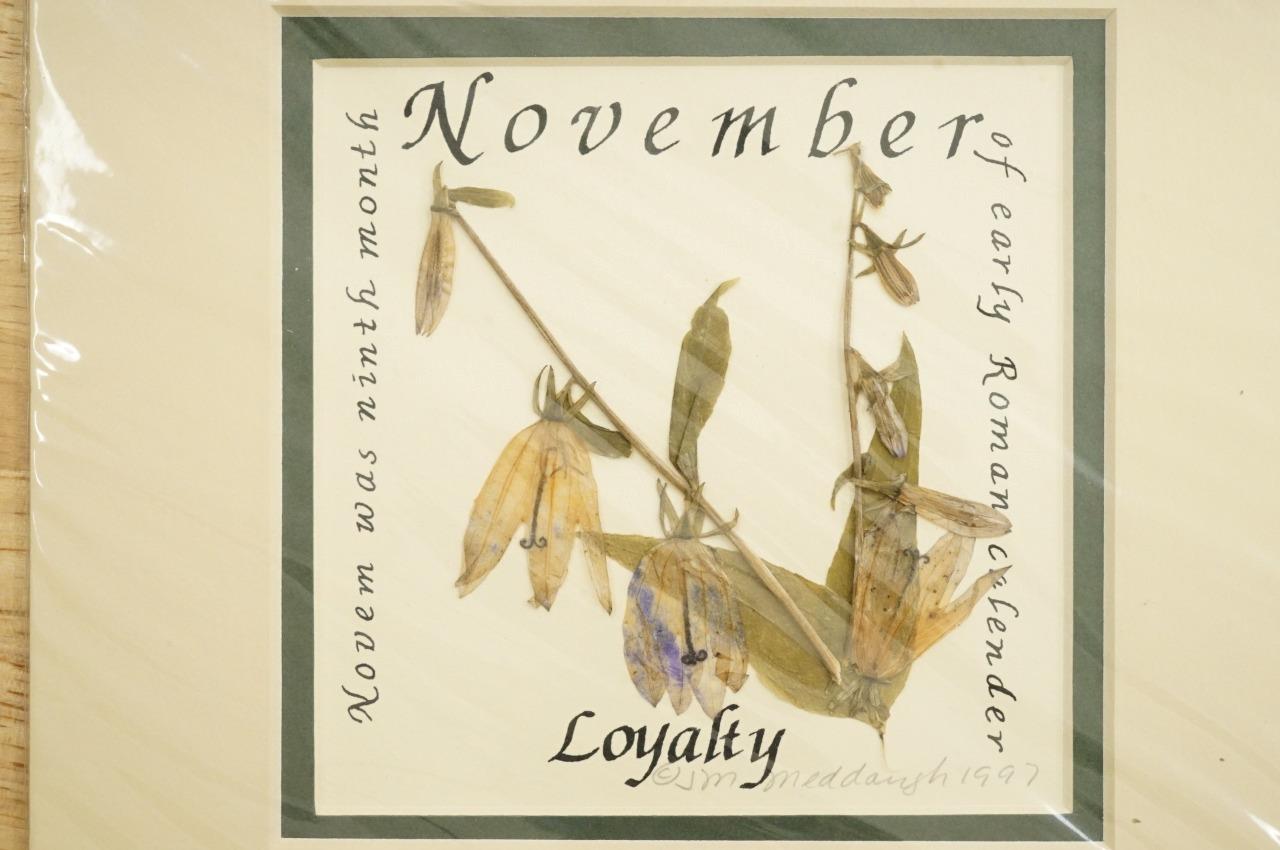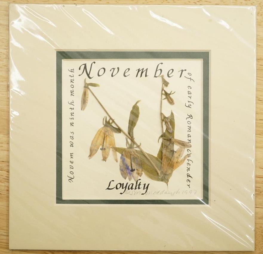 Botanical Art Language of Flowers November Loyalty Dried Pressed Floral 8x8 matted. Ready to frame. Designed and signed by the artist JM Meddaugh 1997. (Gratitude)