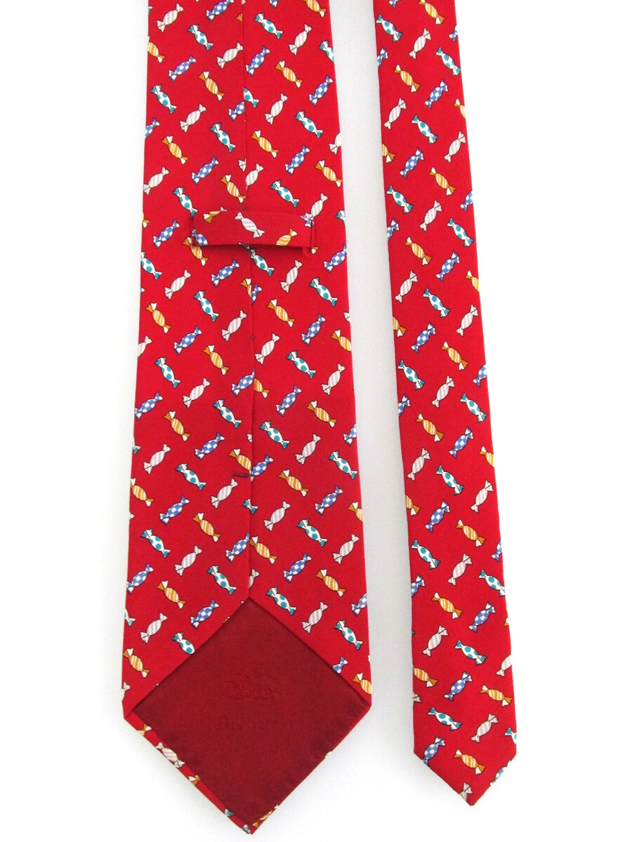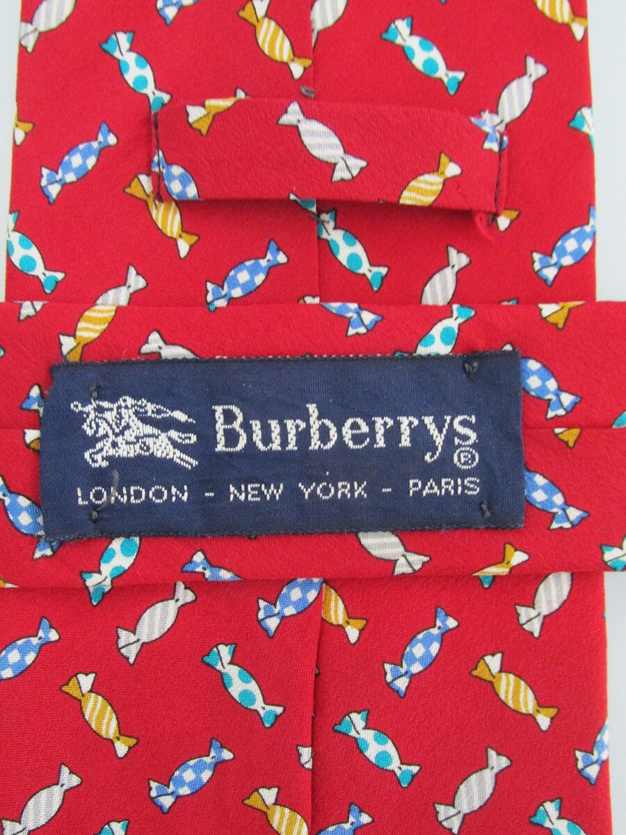 Description: Up for sale is a Burberry designer men's silk tie. The tie is made in France of 100% silk. The tie has a multicolored candy motif in white, blue, green yellow on a red background. Dimensions are approximately 57" long x 3.75" wide. This tie is in excellent condition.