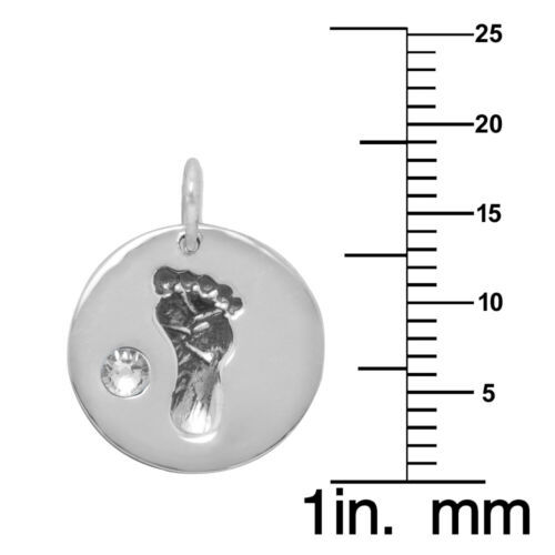 Adorable round pendant features a clear crystal next to a tiny little footprint representing your new baby. The round pendant is accompanied by a silver heart charm. This is the perfect gift for a new parent! The sterling silver pendant suspends from a matching silver 1.5 mm cable chain and secures with a spring ring closure. This necklace is available in your choice of 16 inches to 24 inches. Crafted of .925 sterling silver
