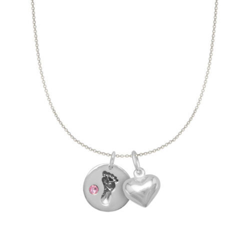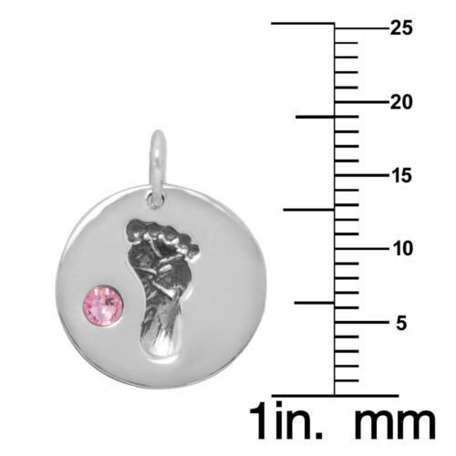 Adorable round pendant features a pink crystal next to a tiny little footprint representing your new baby. The round pendant is accompanied by a silver heart charm. This is the perfect gift for a new parent! The sterling silver pendant suspends from a matching silver 1.5 mm cable chain and secures with a spring ring closure. This necklace is available in your choice of 16 inches to 24 inches. Crafted of .925 sterling silver
