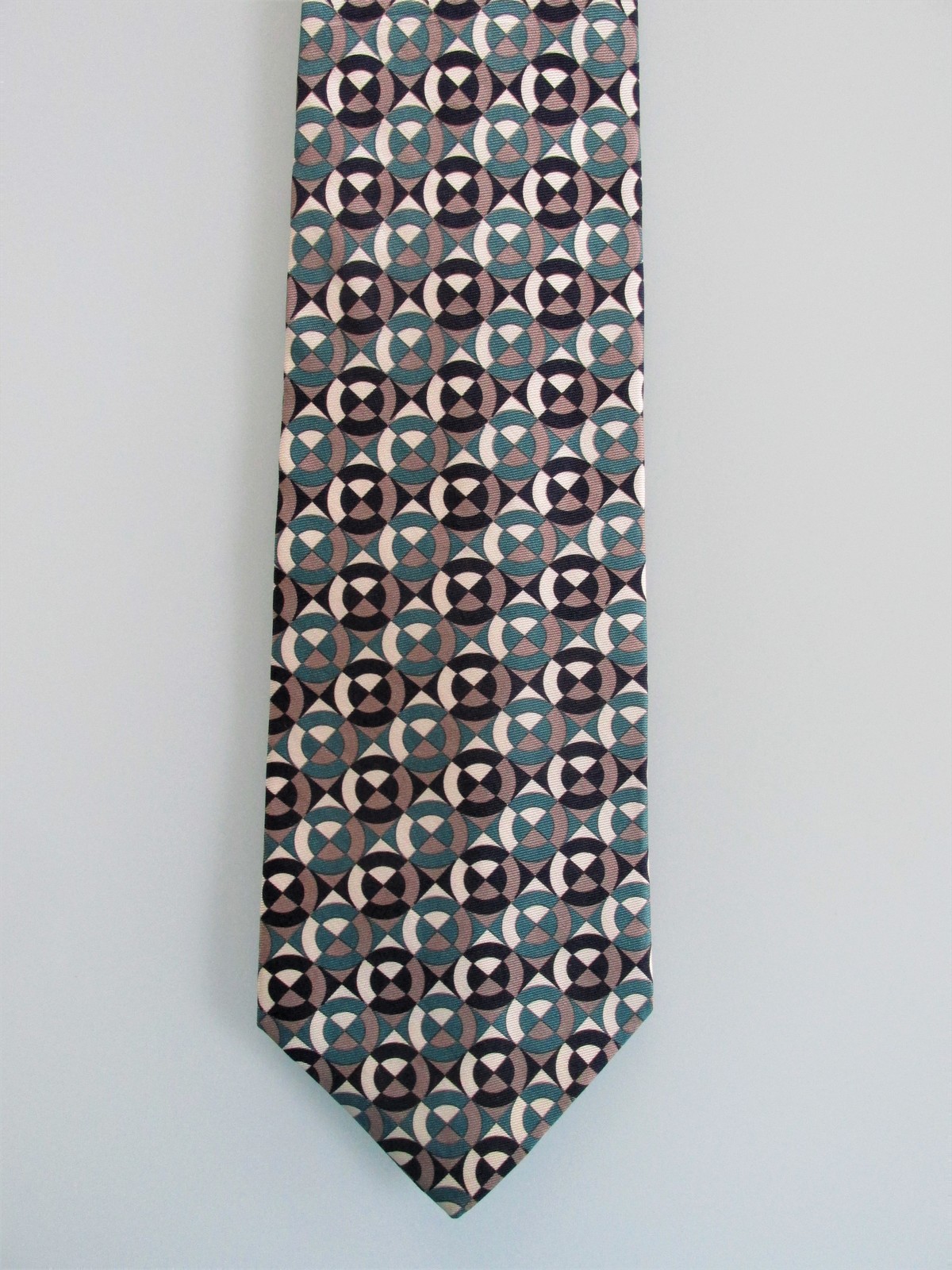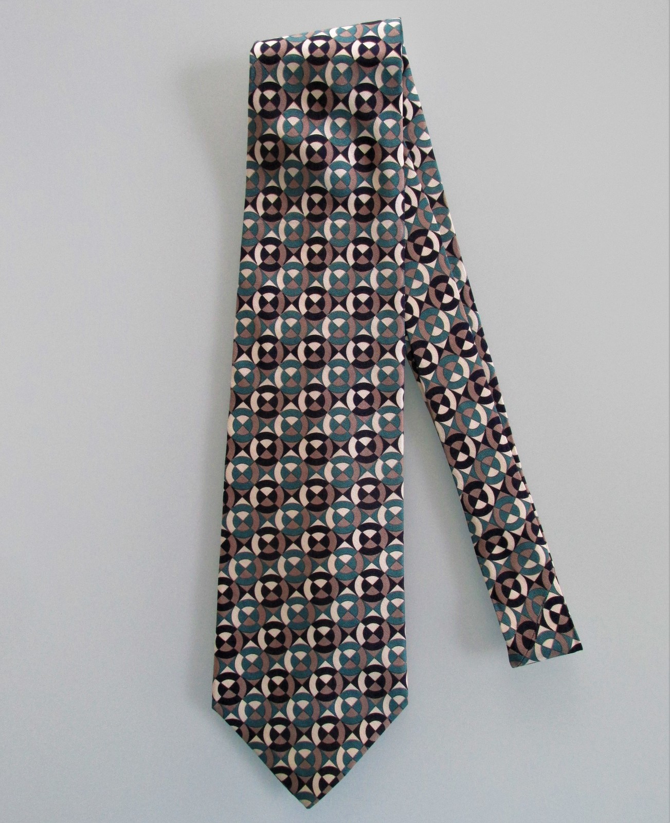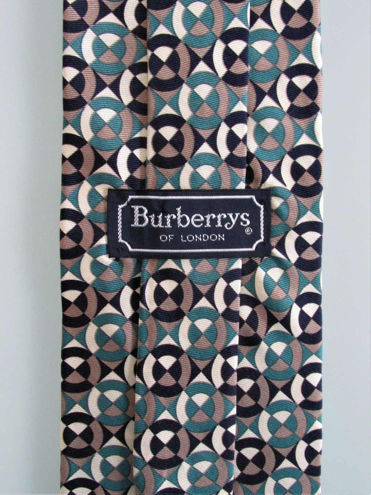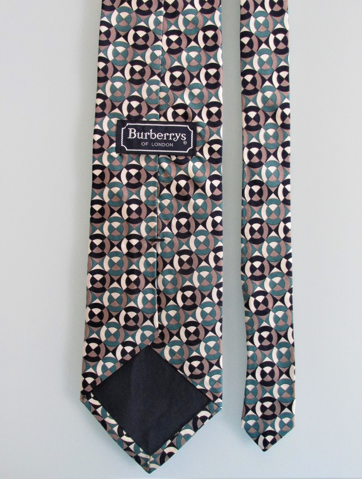 Description: Up for sale is a Burberry men's silk tie. The tie is made in the USA of 100% silk. The tie has a multicolored abstract pattern in green, taupe, black white. Dimensions are approximately 56" long x 3.75" wide. This tie is in excellent condition.