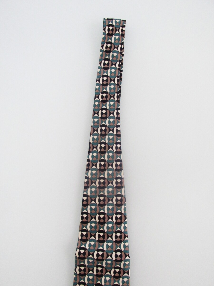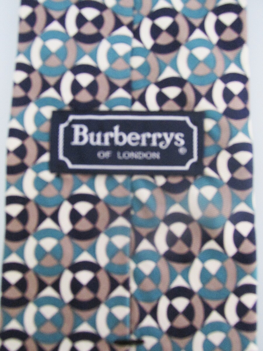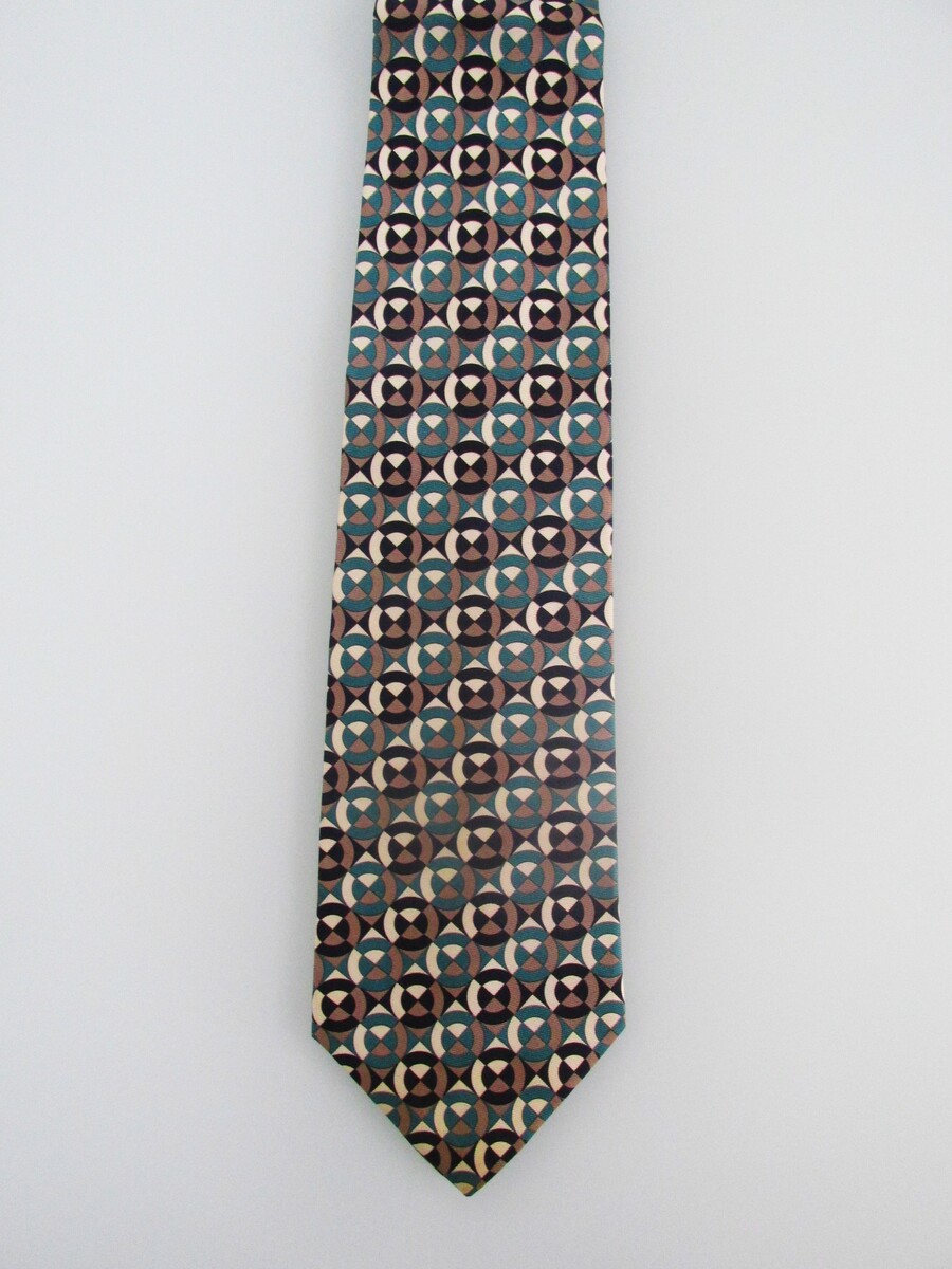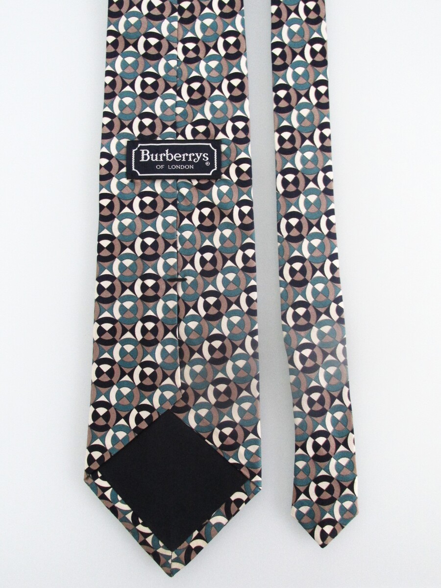 Description: Up for sale is a Burberry designer men's silk tie. The tie is handmade in the USA of 100% silk. The tie has a multicolored abstract pattern in green, taupe, black white. Dimensions are approximately 56" long x 3.75" wide. This tie is in excellent condition.