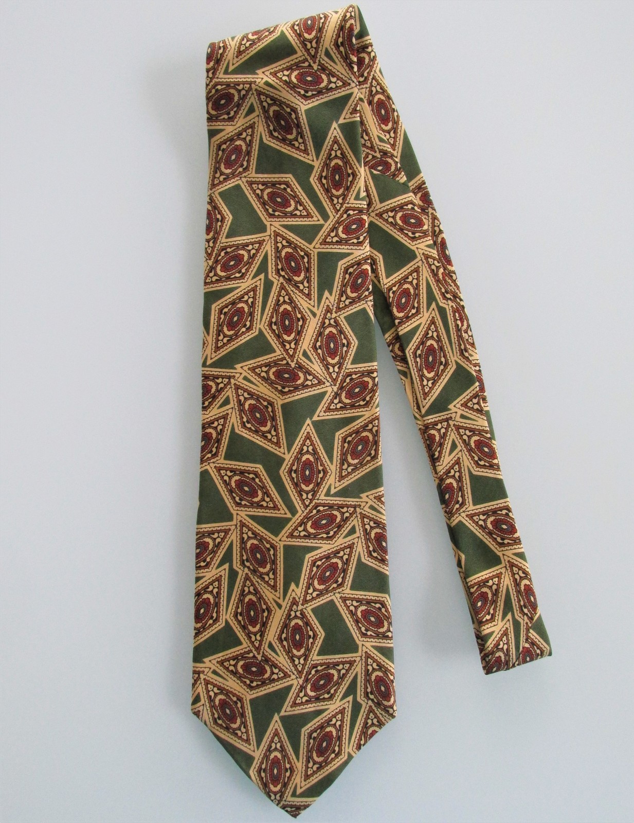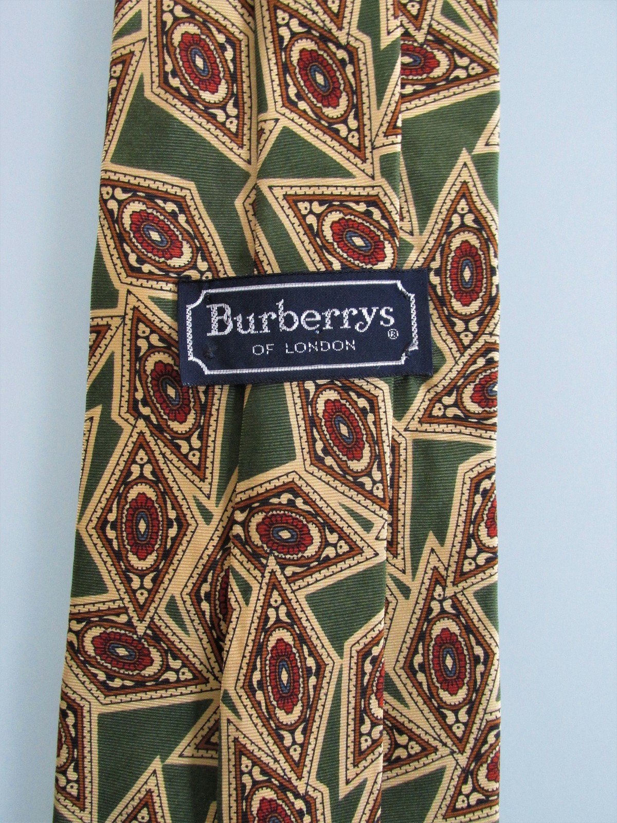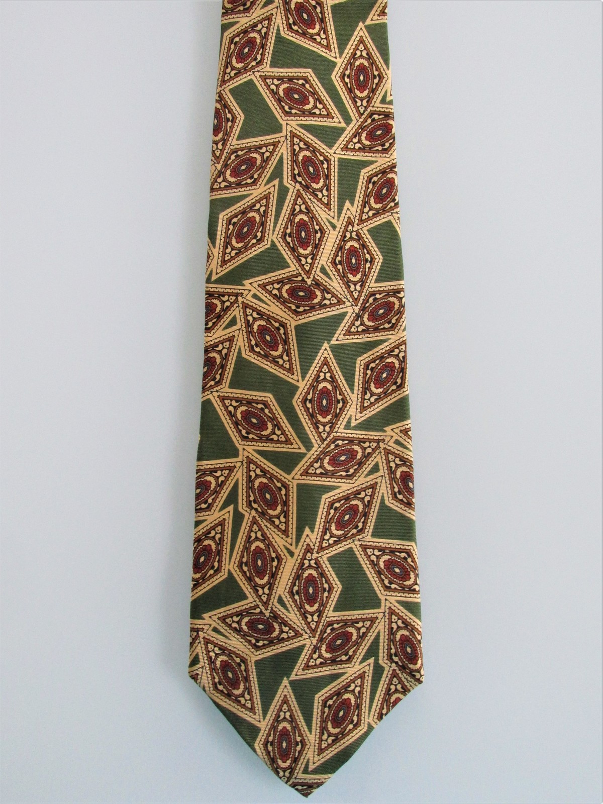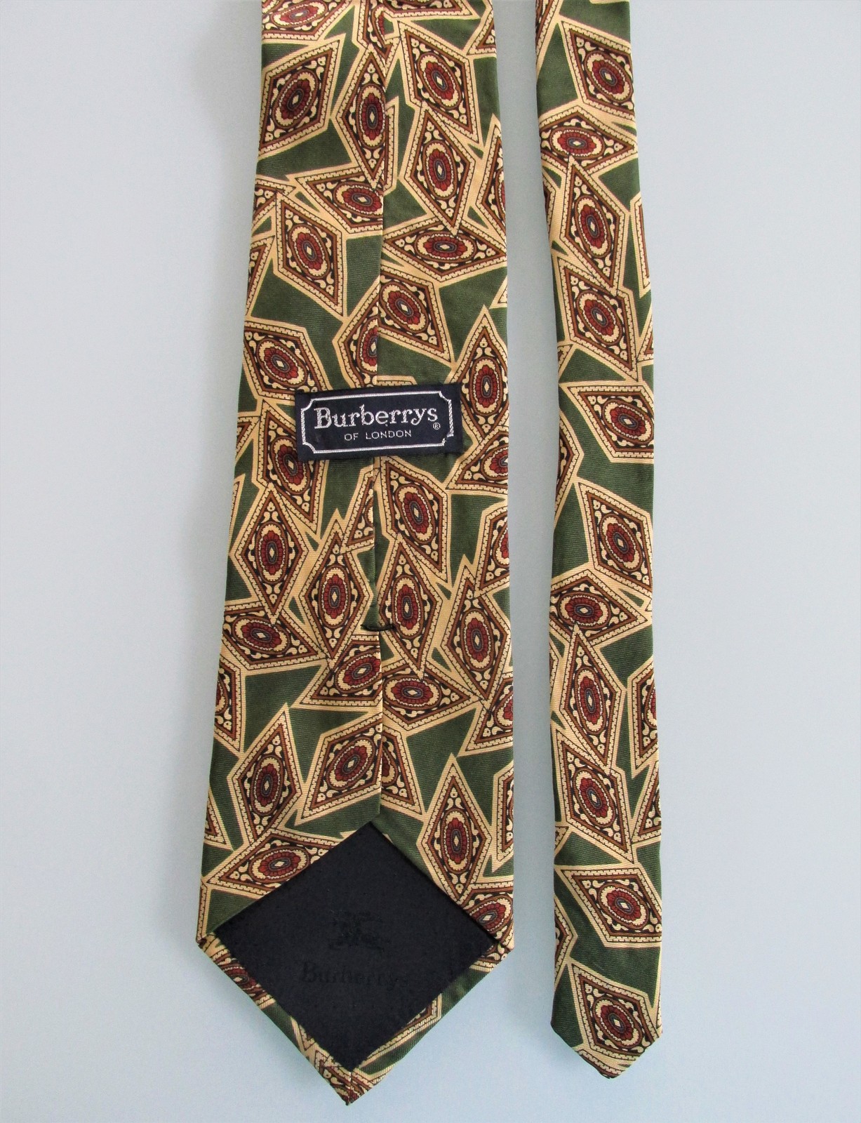 Description: Up for sale is a Burberry men's silk tie. The tie is made in the USA of 100% silk. The tie has an abstract pattern in light gold, olive green, red, black on an olive green background. Dimensions are approximately 57" long x 3.75" wide. This tie is in excellent condition.