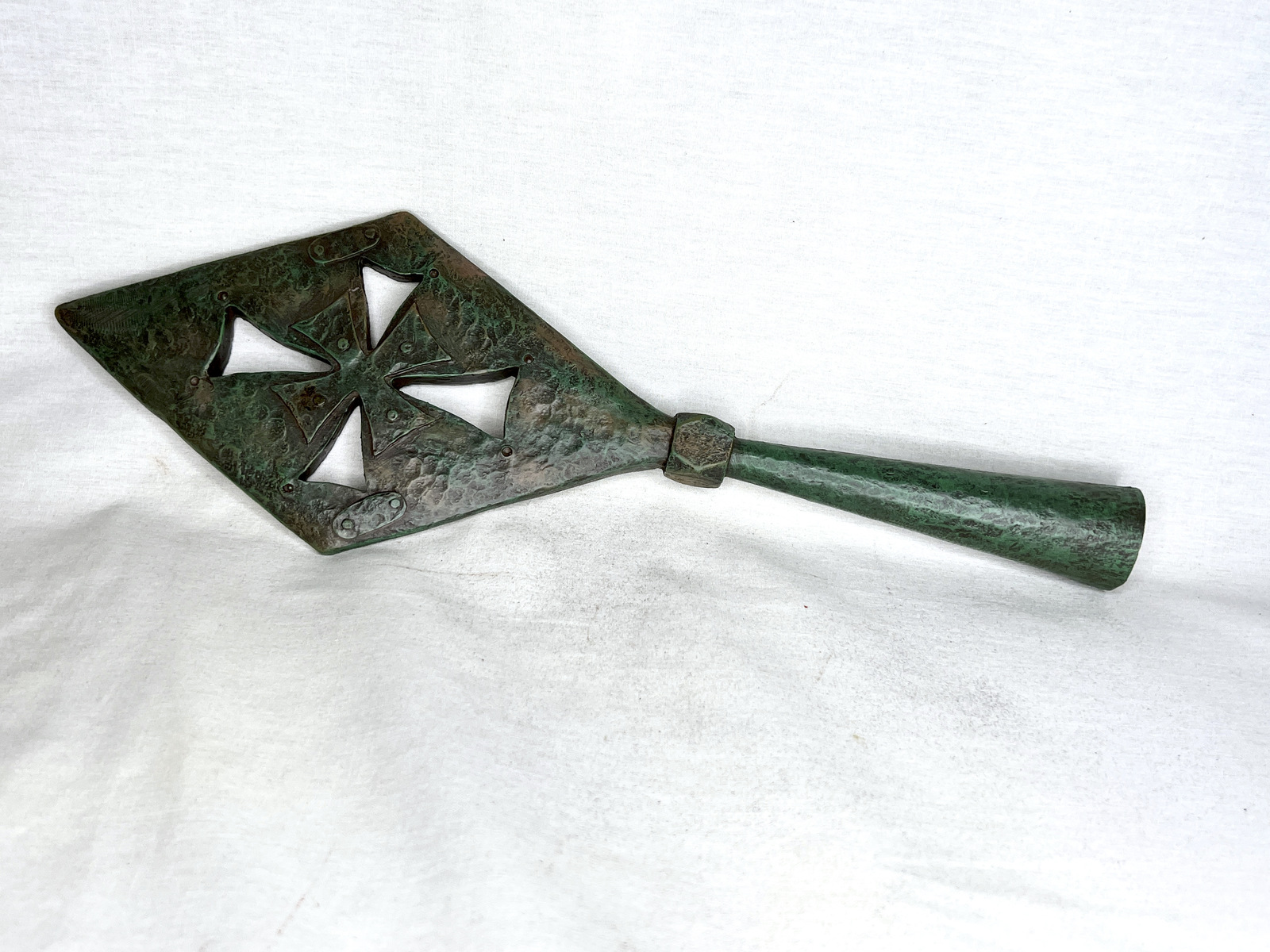 This Armenian Spear of Destiny is made out of Solid Resin and Measures: 14 inches long x 5 inches wide x 2 inches thick. It has a Smooth Bronze Finish with Touches of Patina added just like the Original Armenian Lance. It weighs 3 pounds.