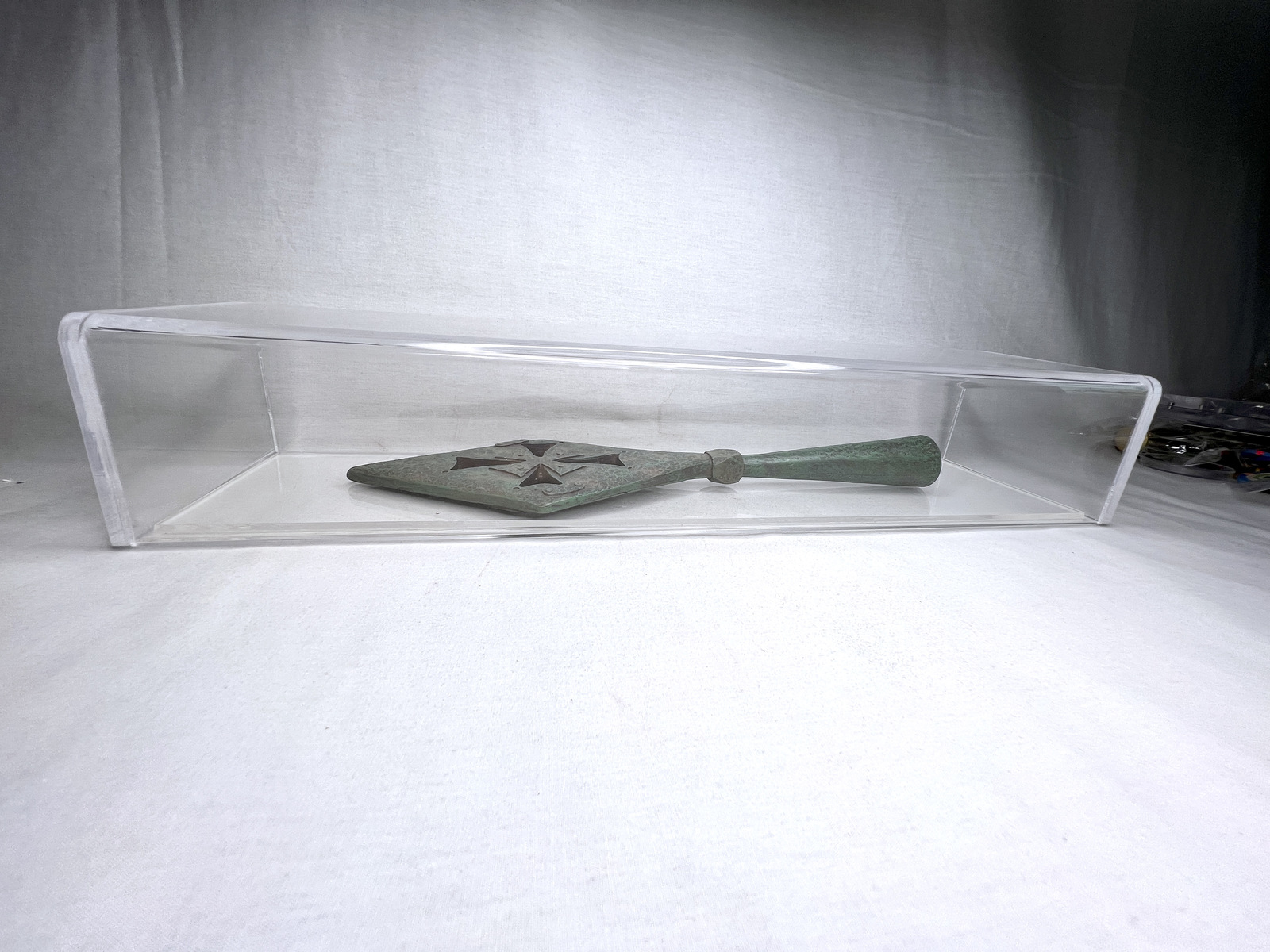 The Case is made out of High Quality .25 inch Acrylic. It measures, in inches; 19.5 Long x 5 Wide x 3.5 high. It is a must to Display the Spear in.