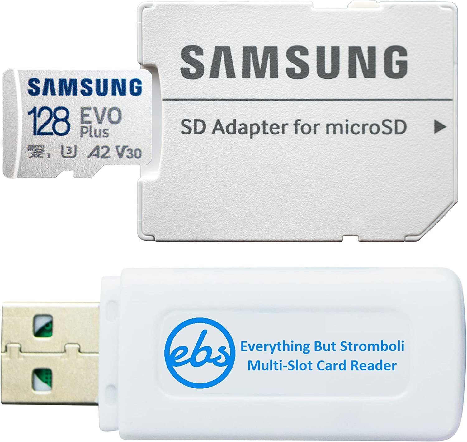 Bundle includes (1) 128GB memory card (Samsung Evo Plus) with adapter and (1) Everything But Stromboli Multi-slot Card Reader - Includes SD, Micro SD (TF), M2, and MS slots for easy transfer This essential Samsung gaming accessory is rated Speed Class 10, UHS-I, U3, 4k, A2, V30 for high quality audio and video capture Samsung Evo Plus Micro SDXC memory cards are the perfect fit for your SDXC compatible devices. Fast read speed up to 130MB/s for high performance and quick transfer times. Samsung memory cards are also water proof, magnet proof, temperature proof, and x-ray proof Whether you are documenting your child?s sporting events, sharing memories with friends, vacationing with family, transferring music, storing files, or filming the action on your latest extreme outdoor adventure, you can rest assured in the reliability of your Samsung Micro card. Works with your compatible camera, action camera, cell phone, smartphone, gaming console, instant camera, laptop, tablet, desktop, Android phones, drone, trail camera, security camera, dash cam, or other device Compatible 128GB memory card for Nintendo Switch, Nintendo Switch lite, and Nintendo Switch OLED